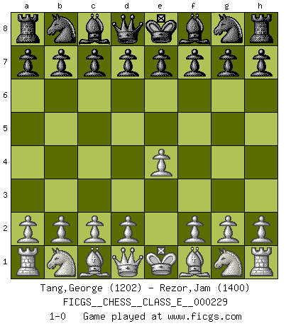 Last move : 1-0 2020 February 5 23:49:38 [Event "FICGS__CHESS__CLASS_E__000229"] [Site "FICGS"] [Date "2019.12.27"] [Round "1"] [White "Tang,George"] [Black "Rezor,Jam"] [Result "1-0"] [WhiteElo "1202"] [BlackElo "1400"] 1.e4 1-0 This chess game has been lost on time (started : 2019.12.27 0:50:6) King's pawn Opening Player White won this chess game. Follow this game move after move (download)Chess is really ninety nine percent calculation. (Soltis) Obwohl ich vom Stil her kaum zu den Priestern der Schachkunst gezählt werde, halte ich Schach doch für eine Kunst. (Tigran Petrosjan) Cuando la partida de Ajedrez termina, el Peón y el Rey regresan a la misma caja. (Irish saying) L'ordinateur a tué l'originalité. Il n'y a plus guère d'aventures sur l'échiquier. (Jacob Murray) When you stop learning you start dying. (Scott Adams)
