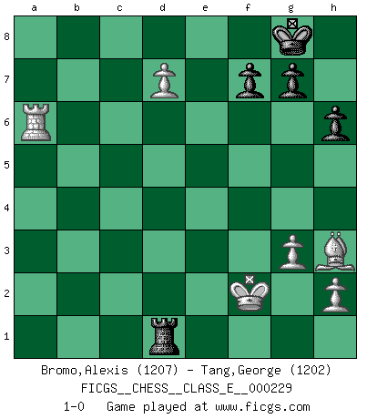 Last move : 1-0 2020 January 29 5:55:25 [Event "FICGS__CHESS__CLASS_E__000229"] [Site "FICGS"] [Date "2019.12.27"] [Round "1"] [White "Bromo,Alexis"] [Black "Tang,George"] [Result "1-0"] [WhiteElo "1207"] [BlackElo "1202"] 1.d4 d5 2.c4 e5 3.e3 exd4 4.exd4 Nf6 5.Nf3 Bg4 6.Be2 Bd6 7.Nc3 c6 8.c5 Bc7 9.b4 O-O 10.O-O Nbd7 11.Re1 Bxf3 12.Bxf3 Re8 13.Bg5 Qb8 14.g3 Rxe1+ 15.Qxe1 h6 16.Bd2 Qe8 17.Qxe8+ Rxe8 18.a4 Ne4 19.Nxe4 dxe4 20.Bg4 Nf6 21.Bh3 Nd5 22.b5 cxb5 23.axb5 a6 24.bxa6 bxa6 25.Rxa6 e3 26.Bxe3 Nxe3 27.fxe3 Rxe3 28.d5 Re1+ 29.Kf2 Rc1 30.d6 Bxd6 31.cxd6 Rd1 32.d7 1-0 QGD : Albin counter-gambit Kingside Castling by player Black (move 9) Kingside Castling by player White (move 10) Player White won this chess game. Follow this game move after move (download)It is not enough to be a good player... you must also play well. (Siegbert Tarrasch) Wenn Dein Gegner dir ein Remis anbietet, versuch herauszufinden, weshalb er glaubt schlechter zu stehen. (Nigel Short) Los errores estan ahí, esperando a que se cometan. (Savielly Tartakower) Le temps de noter son nom sur la feuille de partie, j'étais déjà en zeitnot ! D'un modeste amateur apparié lors de la première ronde d'un open contre le grand-maître Azmaïparashvili. Establishing goals is all right if you don't let them deprive you of interesting detours. (Doug Larson)