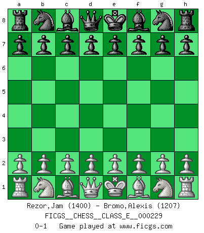 Last move : 0-1 2020 February 5 11:42:8 [Event "FICGS__CHESS__CLASS_E__000229"] [Site "FICGS"] [Date "2019.12.27"] [Round "1"] [White "Rezor,Jam"] [Black "Bromo,Alexis"] [Result "0-1"] [WhiteElo "1400"] [BlackElo "1207"] 0-1 This chess game has been lost on time (started : 2019.12.27 0:50:6) Player Black won this chess game. Follow this game move after move (download)Examine moves that smite! A good eye for smites is far more important than a knowledge of strategical principles. (Purdy) Ich organisiere ein großes Turnier, was mich etwa 120000 Dollar kostet. Ich denke, das ist das erste Mal in der Schachgeschichte, daß ein Schachgroßmeister auch als Mäzen auftritt. (Miguel Najdorf) El Ajedrez te enseña a controlarl la excitación inicial que sientes cuando vez algo que parece bueno y te enseña a pensar objetivamente cuando te encuentras en problemas. (Stanley Kubrick) Les échecs, c'est l'art d'analyser. (Mikhail Botvinnik) Memory is a complicated thing, a relative to truth, but not its twin. (Barbara Kingsolver, Animal Dreams)