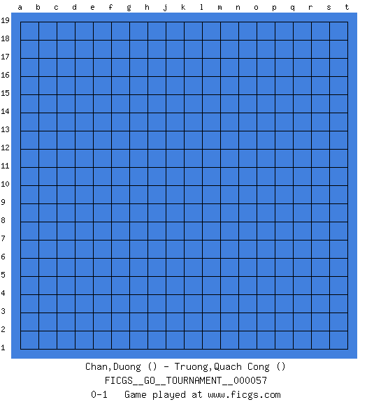 Last move : 0-1 2020 January 27 2:7:0 [Event "FICGS__GO__TOURNAMENT__000057"] [Site "FICGS"] [Date "2019.12.27"] [Round "1"] [Black "Chan,Duong"] [White "Truong,Quach Cong"] [Result "0-1"] 0-1 This go game has been lost on time (started : 2019.12.27 19:0:21) Here are the names of the openings (joseki) played in the four corners : Player White won this Go (weiqi, baduk) game. Follow this game move after move (download)One big eye kills one small eye. (Anonymous) It is not enough to be a good player... you must also play well. (Siegbert Tarrasch)