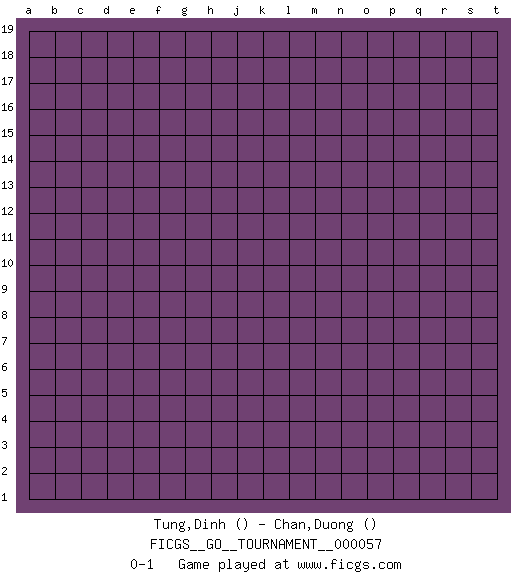 Last move : 0-1 2020 January 27 2:7:0 [Event "FICGS__GO__TOURNAMENT__000057"] [Site "FICGS"] [Date "2019.12.27"] [Round "1"] [Black "Tung,Dinh"] [White "Chan,Duong"] [Result "0-1"] 0-1 This go game has been lost on time (started : 2019.12.27 19:0:21) Here are the names of the openings (joseki) played in the four corners : Player White won this Go (weiqi, baduk) game. Follow this game move after move (download)In an unreasonable situation, an unreasonable move is reasonable. (Tamino) A married woman is like a fish riding a bicycle. (Rodolfo d'Ettorre)