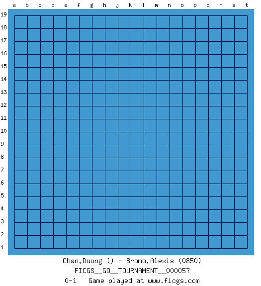 Last move : 0-1 2020 January 27 2:7:0 [Event "FICGS__GO__TOURNAMENT__000057"] [Site "FICGS"] [Date "2019.12.27"] [Round "1"] [Black "Chan,Duong"] [White "Bromo,Alexis"] [Result "0-1"] [Rating 2 "0850"] 0-1 This go game has been lost on time (started : 2019.12.27 19:0:21) Here are the names of the openings (joseki) played in the four corners : Player White won this Go (weiqi, baduk) game. Follow this game move after move (download)You can hide nothing on the goban. (Pierre Audouard) Perception is reality. (Immanuel Kant)
