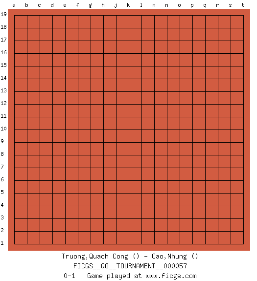 Last move : 0-1 2020 January 27 2:7:0 [Event "FICGS__GO__TOURNAMENT__000057"] [Site "FICGS"] [Date "2019.12.27"] [Round "1"] [Black "Truong,Quach Cong"] [White "Cao,Nhung"] [Result "0-1"] 0-1 This go game has been lost on time (started : 2019.12.27 19:0:21) Here are the names of the openings (joseki) played in the four corners : Player White won this Go (weiqi, baduk) game. Follow this game move after move (download)Don't count territory held by only one eye. (Anonymous) It is not titles that honor men, but men that honor titles. (Niccolo Machiavelli)