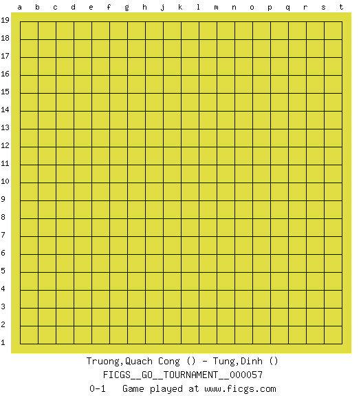 Last move : 0-1 2020 January 27 2:7:0 [Event "FICGS__GO__TOURNAMENT__000057"] [Site "FICGS"] [Date "2019.12.27"] [Round "1"] [Black "Truong,Quach Cong"] [White "Tung,Dinh"] [Result "0-1"] 0-1 This go game has been lost on time (started : 2019.12.27 19:0:21) Here are the names of the openings (joseki) played in the four corners : Player White won this Go (weiqi, baduk) game. Follow this game move after move (download)Learn the eye-stealing tesuji. (Anonymous) For peace of mind, resign as general manager of the universe. (Douglas Adams)