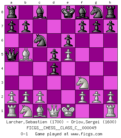 Last move : 0-1 2007 July 1 16:59:11 [Event "FICGS__CHESS__CLASS_C__000049"] [Site "FICGS"] [Date "2007.07.01"] [Round "1"] [White "Larcher,Sebastien"] [Black "Orlov,Vladimir"] [Result "0-1"] [WhiteElo "1700"] [BlackElo "1600"] 1.e4 e6 2.d4 d5 3.e5 c5 4.Nf3 Nc6 5.Be2 cxd4 6.Bb5 Qa5+ 0-1 French : Advance, Nimzovich system Player Black won this chess game. Follow this game move after move (download)The most powerful weapon in Chess is to have the next move. (David Bronstein) Privat ist Kortschnoi kein schlechter Mensch, sehr sympathisch. Aber während des Spiels ist er grausam. Er will dich töten. (Miguel Najdorf) ¡Examina movidas que hagan daño! Un buen ojo for movidas desvastantes es mucho mas importante que el conocimiento de principios estratégicos. (Purdy) Aux échecs, l'amour-propre est satisfait quand on remporte la victoire, mais il n'y a pas de honte à être battu. (Benjamin Franklin) Animated gif is worth one mega-word. (Unknown)