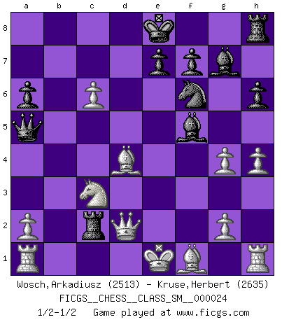 Last move : 1/2-1/2 2020 March 20 19:24:11 [Event "FICGS__CHESS__CLASS_SM__000024"] [Site "FICGS"] [Date "2019.12.28"] [Round "1"] [White "Wosch,Arkadiusz"] [Black "Kruse,Herbert"] [Result "1/2-1/2"] [WhiteElo "2513"] [BlackElo "2635"] 1.e4 c5 2.Nf3 d6 3.d4 cxd4 4.Nxd4 Nf6 5.Nc3 a6 6.Be3 Ng4 7.Bg5 h6 8.Bh4 g5 9.Bg3 Bg7 10.h3 Nf6 11.f3 Nc6 12.Bf2 d5 13.h4 g4 14.Nxc6 bxc6 15.Qd2 Rb8 16.exd5 Rxb2 17.dxc6 Qa5 18.Bd4 Bf5 19.fxg4 Rxc2 1/2-1/2 Sicilian : Najdorf, Byrne (English) attack This chess game ended in a draw. Follow this game move after move (download)A passed Pawn increases in strength as the number of pieces on the board diminishes. (Capablanca) Jeder Schachmeister war einmal ein Anfänger. (Irving Chernev) Una de estas pequeñas movidas modestas pudieran ser mas molestas a tu oponente que la amenaza mas grande. (Siegbert Tarrasch) L'action d'une oeuvre littéraire se déroule sur un champ de bataille. Les masques et les types du drame moderne correspondent aux pièces du jeu d'échecs. L'intrigue correspond aux coups et aux gambits, c'est à dire aux techniques du jeu telles qu'utilisées et interprétées par les joueurs. Les tactiques et les péripéties [mouvements] correspondent aux coups exécutés par l'adversaire. (Viktor Shklovsky) However beautiful the strategy, you should occasionally look at the results. (Winston Churchill)