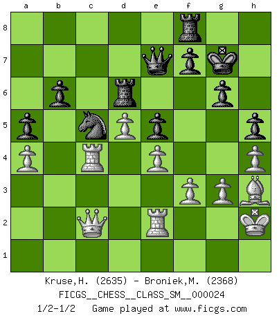 Last move : 1/2-1/2 2020 April 29 8:55:29 [Event "FICGS__CHESS__CLASS_SM__000024"] [Site "FICGS"] [Date "2019.12.28"] [Round "1"] [White "Kruse,Herbert"] [Black "Broniek,Mariusz Maciej"] [Result "1/2-1/2"] [WhiteElo "2635"] [BlackElo "2368"] 1.d4 Nf6 2.c4 e6 3.g3 d5 4.Nf3 dxc4 5.Bg2 Bb4+ 6.Bd2 a5 7.Qc2 Bxd2+ 8.Qxd2 c6 9.a4 Ne4 10.Qc2 Nd6 11.O-O Na6 12.Qc3 Nb4 13.Ne5 Nd5 14.Qc1 O-O 15.Na3 b6 16.Naxc4 Nxc4 17.Nxc4 Nb4 18.Rd1 Ba6 19.b3 Qc7 20.Qb2 Rfd8 21.Rac1 Rac8 22.e4 h6 23.h4 Rb8 24.Rd2 Bxc4 25.bxc4 e5 26.d5 Qd6 27.Rcd1 cxd5 28.cxd5 Na6 29.Qb5 Nc5 30.f3 Qg6 31.Kh2 Rd6 32.Bh3 Qf6 33.Rf1 g6 34.Rc2 Rbd8 35.Rc4 Qe7 36.Rf2 h5 37.Qb1 Kg7 38.Qc2 Rf8 39.Re2 1/2-1/2 Catalan Opening Kingside Castling by player White (move 11) Kingside Castling by player Black (move 14) This chess game ended in a draw. Follow this game move after move (download)Mistrust is the most necessary characteristic of the Chess player. (Siegbert Tarrasch) Kasparov stellt für gewöhnlich die Regeln auf und bricht sie dann selbst wieder. (Alexej Shirov) Hay jugadores fuertes y personas amables y yo soy un jugador fuerte. (Bobby Fischer) Vous n'êtes pas toujours obligé de jouer le meilleur coup. Un coup doit être actif, entreprenant, correct et beau ! (David Bronstein) Philosophers use a language that is already deformed as though by shoes that are too tight. (Ludwig Wittgenstein)