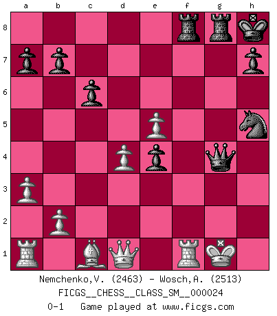 Last move : 0-1 2020 March 13 17:29:9 [Event "FICGS__CHESS__CLASS_SM__000024"] [Site "FICGS"] [Date "2019.12.28"] [Round "1"] [White "Nemchenko,Valery"] [Black "Wosch,Arkadiusz"] [Result "0-1"] [WhiteElo "2463"] [BlackElo "2513"] 1.d4 Nf6 2.Nf3 d5 3.c4 c6 4.e3 Nbd7 5.Nc3 e6 6.Be2 Bd6 7.O-O O-O 8.h3 Ne4 9.cxd5 exd5 10.Bd3 f5 11.Nh2 g5 12.f3 Qc7 13.f4 gxf4 14.exf4 Ndf6 15.Nf3 Qg7 16.Ne5 Be6 17.a3 Kh8 18.Be2 Rg8 19.Bf3 Nh5 20.g4 fxg4 21.hxg4 Bxe5 22.fxe5 Raf8 23.Nxe4 dxe4 24.Be2 Bxg4 25.Bxg4 Qxg4+ 0-1 Queen's pawn game Kingside Castling by player White (move 7) Kingside Castling by player Black (move 7) Player Black won this chess game. Follow this game move after move (download)First-class players lose to second class players because second-class players sometimes play a first-class game. (Tarrasch) Ich bewundere Kasparows phantasievolle Angriffssiege aus den Achtzigern und Neunzigern, aber wenn man sie mit dem Computer überprüft, nimmt der Computer in jeder zweiten Partie die Opfer an, verteidigt sich und gewinnt. (Vladimir Kramnik) De todos mis libros Rusos, la defensa contiene y difunde el 'calor' mas grande que pudiese verse extraño al observar lo supremamente abstracto que el Ajedrez supuestamente es. (Vladimir Nabokov) RxDa4 pat (...) There are two types of people in this world, good and bad. The good sleep better, but the bad seem to enjoy the waking hours much more. (Woody Allen)