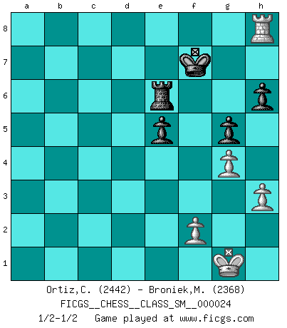 Last move : 1/2-1/2 2020 January 24 10:35:26 [Event "FICGS__CHESS__CLASS_SM__000024"] [Site "FICGS"] [Date "2019.12.28"] [Round "1"] [White "Ortiz,Clodomiro"] [Black "Broniek,Mariusz Maciej"] [Result "1/2-1/2"] [WhiteElo "2442"] [BlackElo "2368"] 1.d4 Nf6 2.c4 e6 3.Nf3 d5 4.Nc3 c6 5.e3 Nbd7 6.Qc2 Bd6 7.Bd3 dxc4 8.Bxc4 O-O 9.O-O b5 10.Bd3 Bb7 11.a3 a5 12.e4 e5 13.dxe5 Nxe5 14.Nxe5 Bxe5 15.h3 Ba6 16.Rb1 Re8 17.Rd1 Qe7 18.b4 Bb7 19.Ne2 axb4 20.axb4 h6 21.Be3 Bd6 22.Nd4 Bxb4 23.Nf5 Qf8 24.Bd4 Re6 25.e5 Nd5 26.Be4 Ra4 27.Rb3 g6 28.Rg3 Kh7 29.Rf3 Ra3 30.Ne3 Be7 31.Bb2 Ra4 32.Nxd5 cxd5 33.Bxd5 Bxd5 34.Rxd5 Rc4 35.Qd2 b4 36.Rd7 R4c6 37.Ra7 Ra6 38.Rc7 Rac6 39.Rxc6 Rxc6 40.Qd7 Re6 41.Rf4 g5 42.Rc4 Qd8 43.Qxd8 Bxd8 44.Rxb4 Kg6 45.g4 f6 46.Rb8 Bc7 47.Rg8+ Kf7 48.Rh8 Bxe5 49.Bxe5 fxe5 1/2-1/2 Queen's pawn game Kingside Castling by player Black (move 8) Kingside Castling by player White (move 9) 10 pieces endgame at move 49 : White KRPPP , Black KRPPP WHITE : King + 1 Rook 3 Pawns BLACK : King + 1 Rook 3 Pawns This chess game ended in a draw. Follow this game move after move (download)Chess is not like life... it has rules ! (Mark Pasternak) Capablanka war das größte Genie der Schachgeschichte! Aber denken sie nicht er habe nichts vom Schach verstanden. Er wusste nur soviel wie er wissen musste um seine Ziele zu erreichen. (Mikhail Moiseyevich Botvinik) La vida es como un juego de Ajedrez, cambiando con cada movimiento. (Proverbio Chino) Psychologiquement, tu dois avoir confiance en toi même, mais cette confiance doit être basée sur des faits. (Robert Fischer) Thus, what is of supreme importance in war is to attack the enemy's strategy. (Sun Tzu)