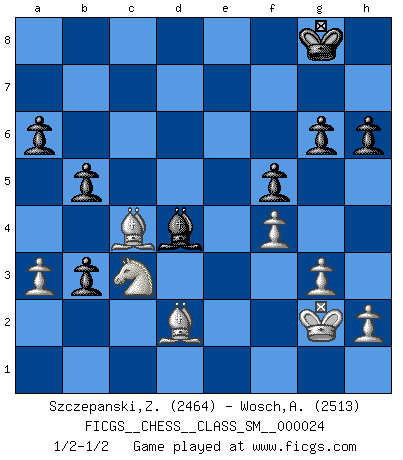 Last move : 1/2-1/2 2020 March 11 20:1:7 [Event "FICGS__CHESS__CLASS_SM__000024"] [Site "FICGS"] [Date "2019.12.28"] [Round "1"] [White "Szczepanski,Zbigniew"] [Black "Wosch,Arkadiusz"] [Result "1/2-1/2"] [WhiteElo "2464"] [BlackElo "2513"] 1.Nf3 Nf6 2.c4 g6 3.d4 Bg7 4.g3 O-O 5.Bg2 d6 6.O-O c5 7.d5 Re8 8.Re1 h6 9.e4 e6 10.Nc3 exd5 11.cxd5 b5 12.e5 dxe5 13.Nxe5 a6 14.a3 Ra7 15.Nc6 Nxc6 16.dxc6 Rxe1+ 17.Qxe1 Re7 18.Be3 Ng4 19.Qd2 Qxd2 20.Bxd2 Re6 21.Re1 Ne5 22.b3 c4 23.f4 Nxc6 24.Rxe6 Bxe6 25.Bxc6 cxb3 26.Be4 Bd4+ 27.Kg2 f5 28.Bd3 Bc4 29.Bxc4+ 1/2-1/2 Reti Opening Kingside Castling by player Black (move 4) Kingside Castling by player White (move 6) This chess game ended in a draw. Follow this game move after move (download)Chess is a more highly symbolic game, but the aggressions are therefore even more frankly represented in the play. It probably began as a war game; that is, the representation of a miniature battle between the forces of two kingdoms. (Karl Meninger) Sie bekommen vielleicht den Eindruck, dass die Spitzenspieler überhaupt gar nicht so stark sind. Aber das stimmt nicht. Es ist eine Illusion. Mit einem Computer an der Seite ist es sehr leicht, Urteile zu fällen, aber wenn man alleine am Brett sitzt, sieht die Sache ganz anders aus. (Vladimir Kramnik) Debió haber existido una vez en que los hombres eran semidióses, de otra manera no hubiesen podido inventar el Ajedrez. (Gustav Schenk) Je fais ceci parce que dans cinquante coups j'obtiendrai cela; je m'appelle Mikhail Moisevitch Botvinnik. (Botvinnik) Experiences are the keys to life. (Daniel Parmet)