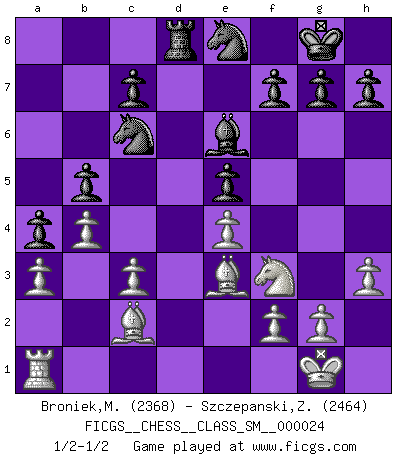 Last move : 1/2-1/2 2020 January 10 20:11:46 [Event "FICGS__CHESS__CLASS_SM__000024"] [Site "FICGS"] [Date "2019.12.28"] [Round "1"] [White "Broniek,Mariusz Maciej"] [Black "Szczepanski,Zbigniew"] [Result "1/2-1/2"] [WhiteElo "2368"] [BlackElo "2464"] 1.e4 e5 2.Nf3 Nc6 3.Bb5 Nf6 4.d3 Bc5 5.Nbd2 d6 6.c3 O-O 7.h3 a6 8.Ba4 b5 9.Bc2 a5 10.O-O a4 11.Re1 Bb6 12.Nf1 d5 13.Bg5 dxe4 14.dxe4 Qxd1 15.Rexd1 Be6 16.Ne3 Bxe3 17.Bxe3 Rfb8 18.b4 Rd8 19.Rxd8+ Rxd8 20.a3 Ne8 1/2-1/2 Ruy Lopez : Berlin defense Kingside Castling by player Black (move 6) Kingside Castling by player White (move 10) This chess game ended in a draw. Follow this game move after move (download)Fischer is completely natural. He plays no roles. He's like a child. Very, very simple. (Zita Rajcsanyi) Ein Springer auf f6 gegen die eigene Rochadestellung ist schlimmer als ein rostiger Nagel im Knie. (Efim Bogoljubov) Fischer sacrificó virtualmente todo lo que la mayoría de nosotros los 'debiles' (término que él usa) valoramos, respetamos y apreciamos por el amor de un astuto, a menudo hermoso tablero de juego, por el privilegio ambivalente de ser su mas grande maestro. (Paul Kollar) On entre au jeu d'Echecs comme on entre en Religion. Pour le joueur d'Echecs, la partie d'Echecs c'est l'office, la messe, le défilé du 1er Mai, le dépôt de gerbe au Monument aux Morts. C'est un drame sacré. (Michel Roos) Political correctness is subjecting us to gross incompetence. (Johann Piek)