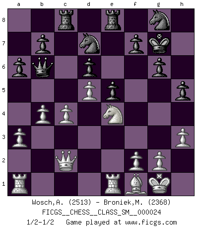Last move : 1/2-1/2 2020 May 25 5:22:40 [Event "FICGS__CHESS__CLASS_SM__000024"] [Site "FICGS"] [Date "2019.12.28"] [Round "1"] [White "Wosch,Arkadiusz"] [Black "Broniek,Mariusz Maciej"] [Result "1/2-1/2"] [WhiteElo "2513"] [BlackElo "2368"] 1.e4 c5 2.Nf3 d6 3.d4 cxd4 4.Nxd4 Nf6 5.Nc3 a6 6.h3 e5 7.Nde2 h5 8.Be3 Be6 9.Nd5 Bxd5 10.exd5 Nbd7 11.c4 g6 12.Nc3 Bh6 13.Bxh6 Rxh6 14.Be2 Rh8 15.a3 Qb6 16.Na4 Qa7 17.O-O Rc8 18.Nc3 Kf8 19.Re1 Kg7 20.Bf1 Rhe8 21.Qd2 Qd4 22.Qc2 Ng8 23.Ne4 Qb6 24.b4 1/2-1/2 Sicilian : Najdorf, Adams attack Kingside Castling by player White (move 17) This chess game ended in a draw. Follow this game move after move (download)Even the laziest King flees wildly in the face of a double check ! (Aaron Nimzowitsch) Du musst nicht gut spielen, es reicht, wenn du besser spielst als dein Gegner. (Anonymous) Entre mas años cumplo, mas valoro los Peones. (Keres) Les Echecs ne sont pas pour les âmes timides. Ils requièrent un homme entier, qui ne s'arrête pas aveuglément à ce qui a été déjà établi, mais qui tente individuellement de sonder les profondeurs du jeu. (W. Steinitz) Every now and then a man's mind is stretched by a new idea and never shrinks back to its former dimensions. (Oliver Wendell Holmes, Sr.)