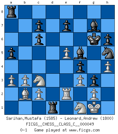 Last move : 0-1 2007 December 18 9:12:24 [Event "FICGS__CHESS__CLASS_C__000049"] [Site "FICGS"] [Date "2007.07.01"] [Round "1"] [White "Sarihan,Mustafa"] [Black "Leonard,Andrew"] [Result "0-1"] [WhiteElo "1585"] [BlackElo "1800"] 1.e4 Nc6 2.Nf3 d6 3.d4 Nf6 4.Bb5 a6 5.Bxc6+ bxc6 6.Nc3 g6 7.Bg5 Bg7 8.O-O h6 9.Bf4 O-O 10.Qd3 g5 11.Be3 a5 12.Rfe1 Qd7 13.h4 g4 14.Nh2 Nh5 15.b3 Qe6 16.a3 Kh7 17.Bd2 Qf6 18.e5 Qg6 19.Qxg6+ Kxg6 20.f3 f5 21.Rad1 g3 22.Nf1 f4 23.Re2 Bf5 24.Bc1 Rfd8 25.Bb2 dxe5 26.dxe5 Rxd1 0-1 This chess game has been lost on time (started : 2007.07.01 1:42:36) KP : Nimzovich defense Kingside Castling by player White (move 8) Kingside Castling by player Black (move 9) Player Black won this chess game. Follow this game move after move (download)A Chess game is divided into three stages: the first, when you hope you have the advantage, the second when you believe you have an advantage, and the third... when you know you're going to lose ! (Savielly Tartakower) Wenn du gegen Bobby spielst, ist es keine Frage von gewinnen oder verlieren. Es ist eine Frage des Überlebens. (Boris Vassilievich Spassky) Un mal plan es mejor que no tener ningún plan. (Frank Marshall) L'attaque fait le spectacle, la défense gagne les matchs. (Dicton footballistique) History is a gallery of pictures in which there are few originals and many copies. (Alexis de Tocqueville)