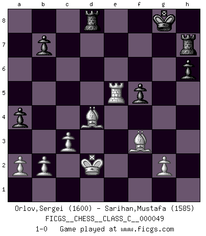 Last move : 1-0 2007 December 26 21:51:48 [Event "FICGS__CHESS__CLASS_C__000049"] [Site "FICGS"] [Date "2007.07.01"] [Round "1"] [White "Orlov,Vladimir"] [Black "Sarihan,Mustafa"] [Result "1-0"] [WhiteElo "1600"] [BlackElo "1585"] 1.e4 e5 2.Nf3 Nf6 3.d4 Nxe4 4.dxe5 Bc5 5.Bc4 Nxf2 6.Bxf7+ Kf8 7.Qd5 Nxh1 8.Bh5 Qe7 9.Bg5 Bf2+ 10.Ke2 Qe6 11.Nc3 h6 12.Bd8 Nc6 13.Bxc7 Ng3+ 14.hxg3 Bxg3 15.Bd6+ Kg8 16.Qe4 Bxe5 17.Nxe5 Nxe5 18.Bxe5 d6 19.Bd4 a5 20.Re1 Qxe4+ 21.Nxe4 Be6 22.Kd3 Bf5 23.Kd2 Rh7 24.Nxd6 g6 25.Bf3 Rd8 26.Nxf5 gxf5 27.c3 a4 28.Re5 1-0 This chess game has been lost on time (started : 2007.07.01 1:42:36) Petrov : Modern attack, Symmetrical variation Player White won this chess game. Follow this game move after move (download)I am the best player in the world and I am here to prove it. (Bobby Fischer) Im Fernschach kannst du während dem Spiel rauchen. (John Christen Knudsen) Un juego de Ajedrez es un dialogo, una conversación entre un jugador y su oponente. Cada movimiento del oponente puede contener amenazas o tropiezos, pero un jugador no se puede defender de las amenazas o tomar ventaja de los tropiezos si es que no se pregunta a sí mismo: ¿Que es lo que mi oponente va a hacer después de cada movida?. (Bruce A. Moon) On est toujours la mazette de quelqu'un d'autre. (Anonyme) I feel so... helpless. (C-3PO in Star Wars ep.3)