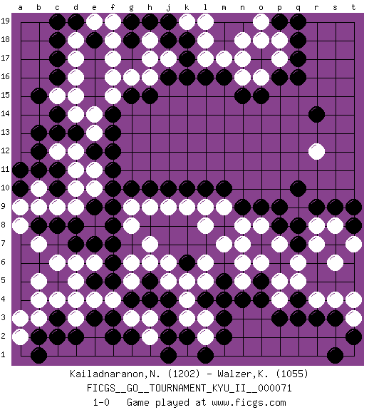 Last move : 1-0 2020 April 23 13:32:19 [Event "FICGS__GO__TOURNAMENT_KYU_II__000071"] [Site "FICGS"] [Date "2019.12.29"] [Round "1"] [Black "Kailadnaranon,Nanthwat"] [White "Walzer,Karel"] [Result "1-0"] [Rating 1 "1202"] [Rating 2 "1055"] 1.q16 d4 2.q3 d16 3.r9 q5 4.o4 r4 5.r3 r7 6.p8 o6 7.m5 n7 8.n9 m7 9.f3 h3 10.f5 d6 11.f7 d9 12.k6 l8 13.c14 c12 14.c17 d17 15.c16 d14 16.d13 c15 17.b15 d15 18.c13 d12 19.b13 e13 20.b11 b9 21.c3 d3 22.d2 c4 23.b2 b4 24.e12 d11 25.f13 e14 26.f11 h16 27.k16 o16 28.o15 n16 29.p16 l17 30.k17 j17 31.k18 l18 32.j18 h18 33.h15 g16 34.j16 h17 35.g15 f15 36.f14 f16 37.l10 k9 38.k10 h9 39.f9 s8 40.s9 s4 41.s3 s6 42.n15 p18 43.q18 p17 44.q17 n18 45.m16 m17 46.l16 r12 47.r14 q9 48.q8 r8 49.q10 l3 50.m2 l2 51.g2 h2 52.j4 g3 53.f2 m4 54.m3 l5 55.n4 l6 56.l4 k4 57.j3 k5 58.j2 j6 59.h5 j5 60.h4 k3 61.j10 j9 62.h10 h7 63.c10 d10 64.c8 c9 65.d8 b7 66.b8 a8 67.d7 c6 68.b12 b5 69.o17 n17 70.p19 o18 71.c18 d18 72.d19 e19 73.c19 b3 74.c2 b10 75.c11 e6 76.f6 g8 77.f8 g9 78.g10 e4 79.e3 f4 80.g4 p4 81.p3 o8 82.o9 p7 83.q7 q6 84.p9 n8 85.q4 p5 86.t8 t7 87.t9 t3 88.t2 t4 89.s1 g6 90.e5 d5 91.e7 h6 92.e9 n5 93.o5 n6 94.m4 m9 95.m10 e11 96.f12 a9 97.l1 e10 98.k2 g5 99.f10 a2 100.e18 f19 101.g19 f18 102.g18 f17 103.h19 l9 104.a11 k1 105.j1 o19 106.q19 a3 107.b1 k19 108.j19 l19 109.a10 1-0 Here are the names of the openings (joseki) played in the four corners : Corner d4 : d4 f3 Hoshi (Hwajeom, Seongjeom, Xingwei`) 4-4 Point. The star or hoshi (4-4) point, emphasizing influence at the potential expense of territory. Ikken Kakari (Hankan Keolch'im, Yi Gua`jiao~, 1-Space Low Approach). Black 2 is the standard approach move to the 4-4. Corner d16 : d16 c14 Hoshi (Hwajeom, Seongjeom, Xingwei`) 4-4 Point. The star or hoshi (4-4) point, emphasizing influence at the potential expense of territory. Ikken Kakari (Hankan Keolch'im, Yi Gua`jiao~, 1-Space Low Approach). Black 2 is the standard approach move to the 4-4. Corner q16 : q16 o16 Hoshi (Hwajeom, Seongjeom, Xingwei`) 4-4 Point. The star or hoshi (4-4) point, emphasizing influence at the potential expense of territory. Ikken Takagakari (Hankan Nop'dakeolch'im, Yi Gaojia, 1-Space High Approach). Black typically responds at 6-4 or 3-10. Black 4-10 is played when Black finds play on the right side advantageous. Black 4-8 or 3-8 may be played when Black has support at top. Player Black won this Go (weiqi, baduk) game. Follow this game move after move (download)Win the stones, lose the game. (Anonymous) Creativity is inventing, experimenting, growing, taking risks, breaking rules, making mistakes, and having fun. (Mary Lou Cook)