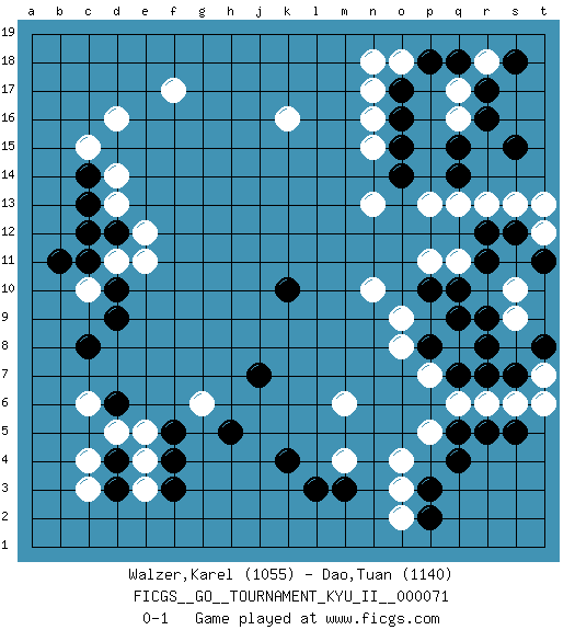 Last move : 0-1 2020 April 10 13:16:22 [Event "FICGS__GO__TOURNAMENT_KYU_II__000071 "] [Site "FICGS"] [Date "2019.12.29"] [Round "1"] [Black "Walzer,Karel "] [White "Dao,Tuan "] [Result "0-1"] [Rating 1 "1055"] [Rating 2 "1140"] 1.d4 q16 2.q4 d16 3.k4 k16 4.o16 n16 5.o15 n15 6.o14 n13 7.q14 p13 8.q15 q13 9.r16 q17 10.r17 r18 11.s18 n17 12.o17 o18 13.p18 n18 14.q18 c6 15.c8 c3 16.d3 c4 17.d6 d5 18.f4 e5 19.c14 d14 20.c13 g6 21.h5 d11 22.c11 c10 23.b11 q6 24.r5 c15 25.d12 e12 26.d10 e11 27.d9 d13 28.c12 f17 29.q10 o3 30.p3 o4 31.r12 r6 32.q5 p7 33.r8 q8 34.r9 p11 35.p10 p5 36.m3 s6 37.s5 m4 38.l3 o2 39.p2 m6 40.k10 n10 41.j7 e4 42.f3 e3 43.f5 r13 44.s12 s13 45.s15 q11 46.r11 s10 47.s7 t7 48.t8 t6 49.q9 t12 50.t11 t13 51.p8 o8 52.q7 o9 53.r7 s9 0-1 Here are the names of the openings (joseki) played in the four corners : Corner q16 : q16 o16Hoshi (Hwajeom, Seongjeom, Xingwei`) 4-4 Point. The star or hoshi (4-4) point, emphasizing influence at the potential expense of territory.Ikken Takagakari (Hankan Nop'dakeolch'im, Yi Gaojia, 1-Space High Approach). White typically responds at 6-4 or 3-10. White 4-10 is played when White finds play on the right side advantageous. White 4-8 or 3-8 may be played when White has support at top. Corner d4 : d4 c6Hoshi (Hwajeom, Seongjeom, Xingwei`) 4-4 Point. The star or hoshi (4-4) point, emphasizing influence at the potential expense of territory.Ikken Kakari (Hankan Keolch'im, Yi Gua`jiao~, 1-Space Low Approach). White 2 is the standard approach move to the 4-4. Corner d16 : d16 c14Hoshi (Hwajeom, Seongjeom, Xingwei`) 4-4 Point. The star or hoshi (4-4) point, emphasizing influence at the potential expense of territory.Ikken Kakari (Hankan Keolch'im, Yi Gua`jiao~, 1-Space Low Approach). Black 2 is the standard approach move to the 4-4. Corner q4 : q4 q6Hoshi (Hwajeom, Seongjeom, Xingwei`) 4-4 Point. The star or hoshi (4-4) point, emphasizing influence at the potential expense of territory.Ikken Takagakari (Hankan Nop'dakeolch'im, Yi Gaojia, 1-Space High Approach). Black typically responds at 6-4 or 3-10. Black 4-10 is played when Black finds play on the right side advantageous. Black 4-8 or 3-8 may be played when Black has support at top. Player White won this Go (weiqi, baduk) game.Follow this game move after move (download ) There are possible things, impossible things, and things that happen. Sometimes things happen that were impossible. (Pierre Audouard) A government big enough to give you everything you want is strong enough to take everything you have. (Thomas Jefferson)
