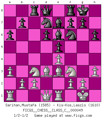 Last move : 1/2-1/2 2007 September 28 6:42:24 [Event "FICGS__CHESS__CLASS_C__000049"] [Site "FICGS"] [Date "2007.07.01"] [Round "1"] [White "Sarihan,Mustafa"] [Black "Kis-Kos,Laszlo"] [Result "1/2-1/2"] [WhiteElo "1585"] [BlackElo "1610"] 1.e4 c5 2.Nf3 d6 3.d4 cxd4 4.Nxd4 Nf6 5.Nc3 a6 6.Be2 e5 7.Nf3 h6 8.O-O Be6 9.Be3 Nbd7 10.Re1 Rc8 11.a3 Be7 12.h3 O-O 13.Bd3 1/2-1/2 Sicilian : Najdorf, Opovcensky variation Kingside Castling by player White (move 8) Kingside Castling by player Black (move 12) This chess game ended in a draw. Follow this game move after move (download)What is the object of playing a gambit opening?... To acquire a reputation of being a dashing player at the cost of losing a game. (Siegbert Tarrasch) Es liegt in der Natur, vernüftig zu denken und unlogisch zu handeln. (Anatole France) La mitad de las variaciones que son calculadas en una partida de torneo, resultan ser completamente superfluas. Desafortunadamente, nadie sabe por adelantado cual mitad. (Jan Tinman) Tout change constamment, y compris dans le monde des Echecs. (Botvinnik) What doesn't kill us makes us stronger. (Friedrich Nietzsche)