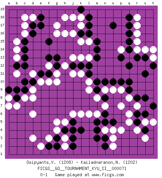 Last move : 0-1 2020 January 17 18:43:58 [Event "FICGS__GO__TOURNAMENT_KYU_II__000071"] [Site "FICGS"] [Date "2019.12.29"] [Round "1"] [Black "Osipyants,Vladimir"] [White "Kailadnaranon,Nanthwat"] [Result "0-1"] [Rating 1 "1208"] [Rating 2 "1202"] 1.q16 d3 2.d16 r4 3.k16 r14 4.q12 p14 5.o17 d6 6.k4 o3 7.q9 r17 8.q17 r16 9.q15 r15 10.q14 j13 11.p13 c17 12.d17 c16 13.c15 b15 14.c14 b14 15.c13 b13 16.d10 j16 17.j17 h16 18.h17 k15 19.l16 g16 20.m14 g17 21.f15 l15 22.m15 k17 23.l17 k18 24.l18 h18 25.k19 j18 26.r6 q6 27.q7 q5 28.g3 c8 29.c9 d8 30.b12 g5 31.n3 n4 32.m3 o2 33.m4 k6 34.m10 m6 35.n8 l9 36.n2 h3 37.h4 g4 38.j3 h2 39.g2 h5 40.j4 f3 41.f2 e2 42.j2 e10 43.e11 f10 44.f11 g10 45.r13 r18 46.q18 r7 47.r8 s7 48.s8 p7 49.s6 q8 50.t7 p9 51.q7 r7 52.q10 l10 53.p10 o9 54.n10 n9 55.m9 m8 56.n5 o4 57.m5 n7 58.l11 k11 59.l12 d9 60.c10 g11 61.f13 d18 62.e18 c18 63.e17 s14 64.s13 l13 65.k12 j11 66.m13 k13 67.o10 t5 68.s4 s5 69.r5 s3 70.o5 p4 71.n6 l6 72.j5 j6 73.b8 b7 74.b9 a8 75.a9 a7 76.j12 h12 77.g13 t13 78.t12 t14 79.s11 f12 80.g12 b11 81.c12 d11 0-1 Here are the names of the openings (joseki) played in the four corners : Corner q16 : q16 r14 Hoshi (Hwajeom, Seongjeom, Xingwei`) 4-4 Point. The star or hoshi (4-4) point, emphasizing influence at the potential expense of territory. Ikken Kakari (Hankan Keolch'im, Yi Gua`jiao~, 1-Space Low Approach). White 2 is the standard approach move to the 4-4. Corner d16 : d16 j13 Hoshi (Hwajeom, Seongjeom, Xingwei`) 4-4 Point. The star or hoshi (4-4) point, emphasizing influence at the potential expense of territory. Player White won this Go (weiqi, baduk) game. Follow this game move after move (download)Go is to western chess what philosophy is to double entry accounting. (from Shibumi, by Trevanian) All art requires courage. (Anne Tucker)