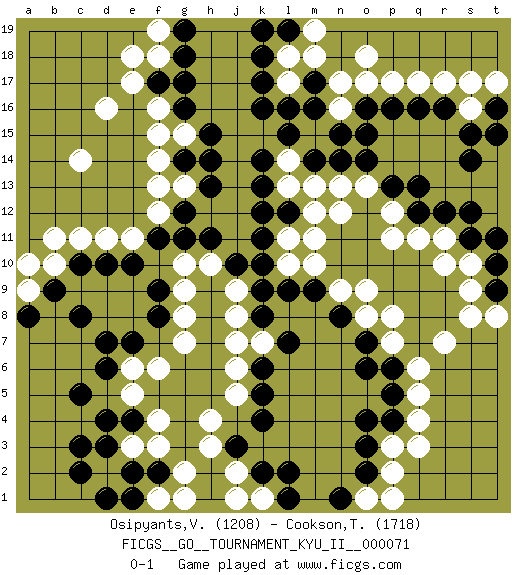 Last move : 0-1 2020 May 2 16:19:22 [Event "FICGS__GO__TOURNAMENT_KYU_II__000071"] [Site "FICGS"] [Date "2019.12.29"] [Round "1"] [Black "Osipyants,Vladimir"] [White "Cookson,Timothy"] [Result "0-1"] [Rating 1 "1208"] [Rating 2 "1718"] 1.q16 q4 2.d3 d16 3.c5 r17 4.r16 q17 5.p16 o18 6.q13 r7 7.k4 c14 8.o3 p2 9.o2 p3 10.o4 h3 11.j3 h4 12.k6 e3 13.e4 d2 14.c3 f4 15.e2 f3 16.f2 g2 17.c2 j2 18.k2 r10 19.d10 f1 20.d1 g7 21.d7 j5 22.k5 k1 23.l1 j1 24.l2 q6 25.m17 n17 26.m16 m18 27.k16 c11 28.c10 d11 29.g16 e17 30.f17 b10 31.b9 l17 32.k17 n16 33.l16 b11 34.c8 f18 35.g18 s16 36.s15 f16 37.g17 f15 38.f9 j6 39.n15 q11 40.o7 f12 41.h14 g13 42.h13 s17 43.s14 p12 44.p13 n12 45.l9 l18 46.k18 e18 47.s11 s10 48.s12 o9 49.n8 e5 50.d4 f6 51.h11 n9 52.m9 o13 53.o15 m13 54.l12 l13 55.k12 j8 56.k8 p7 57.o6 j9 58.g14 f14 59.g12 f13 60.f11 e11 61.e10 o8 62.p6 m11 63.k10 q5 64.p4 q3 65.k13 l14 66.k14 p17 67.o16 o17 68.l15 m10 69.t10 s9 70.t9 s8 71.q12 p11 72.o14 j7 73.k9 t8 74.t11 r11 75.r12 o1 76.n1 p1 77.l19 m19 78.k19 g10 79.g11 g9 80.f8 g8 81.e7 e6 82.d6 m12 83.m14 n13 84.n14 g1 85.e1 h10 86.j10 k7 87.l7 a9 88.a8 a10 89.t16 t17 90.t15 f19 91.g19 p8 92.p5 l11 93.k11 g15 94.h15 l10 0-1 Here are the names of the openings (joseki) played in the four corners : Corner q16 : q16 r17 Hoshi (Hwajeom, Seongjeom, Xingwei`) 4-4 Point. The star or hoshi (4-4) point, emphasizing influence at the potential expense of territory. Player White won this Go (weiqi, baduk) game. Follow this game move after move (download)Don't make territory near thickness. (Anonymous) Logic : The art of thinking and reasoning in strict accordance with the limitations and incapacities of the human misunderstanding. (Ambrose Bierce)