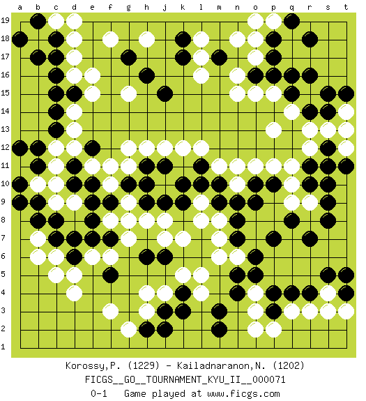 Last move : 0-1 2020 April 15 7:43:34 [Event "FICGS__GO__TOURNAMENT_KYU_II__000071"] [Site "FICGS"] [Date "2019.12.29"] [Round "1"] [Black "Korossy,Peter"] [White "Kailadnaranon,Nanthwat"] [Result "0-1"] [Rating 1 "1229"] [Rating 2 "1202"] 1.q16 d4 2.q4 d17 3.c15 e16 4.b17 o17 5.o16 n16 6.p17 o15 7.p16 n15 8.r14 d14 9.d15 e15 10.c14 d13 11.b12 o3 12.m3 r3 13.r4 q3 14.p4 o2 15.n5 r9 16.r7 f3 17.j3 c11 18.c18 d18 19.r11 q11 20.r10 q10 21.s9 q9 22.s8 p13 23.k10 k12 24.g10 g12 25.d10 o18 26.p18 f10 27.f9 f11 28.e9 c5 29.d7 h4 30.h2 j4 31.f5 h3 32.k3 g2 33.j2 l5 34.n4 g9 35.h9 g8 36.h11 h12 37.h6 h8 38.j9 j7 39.j6 k7 40.b11 c10 41.b9 c9 42.b8 b6 43.c7 e6 44.e7 f6 45.m9 m7 46.n8 m11 47.p7 r12 48.s12 r15 49.q15 s11 50.s10 s13 51.t11 r13 52.s14 t14 53.t15 t13 54.s15 q14 55.r16 n18 56.o10 o11 57.e12 d12 58.d11 e11 59.f7 c12 60.c13 g7 61.p3 p2 62.d6 d5 63.m17 l17 64.k17 l16 65.g17 l18 66.k18 f18 67.j15 g15 68.h16 h18 69.k4 k5 70.m2 s4 71.s5 s3 72.t4 t3 73.t5 n10 74.o9 m8 75.n9 l9 76.l10 l8 77.m10 n11 78.n7 o4 79.o5 p15 80.c17 b7 81.c8 b10 82.a10 a11 83.a12 f8 84.e8 d9 85.e10 g11 86.h10 p19 87.q19 o19 88.r18 t12 89.s11 d16 90.c16 c19 91.b19 d19 92.a18 m6 93.l11 l12 94.j11 j12 95.p10 p11 96.q8 n6 97.o6 c6 98.a9 j8 99.k9 l4 0-1 Here are the names of the openings (joseki) played in the four corners : Corner d16 : d17 c15 Komoku (Somok, Xiao~mu`) 3-4 Point. The komoku (3-4) point is the traditional corner enclosure move.. Ikken Kakari (Hankan Keolch'im, Yi Gua`jiao~, 1-Space Low Pincer). The small knight move is the basic approach move to the 3-4 point stone. It has been continually used for over four centuries. There are limitless variations, with new moves constantly being discovered. Black 2 opens the door to a treaure store of joseki. Corner q16 : q16 o17 Hoshi (Hwajeom, Seongjeom, Xingwei`) 4-4 Point. The star or hoshi (4-4) point, emphasizing influence at the potential expense of territory. Ikken Kakari (Hankan Keolch'im, Yi Gua`jiao~, 1-Space Low Approach). White 2 is the standard approach move to the 4-4. Corner q4 : q4 o3 Hoshi (Hwajeom, Seongjeom, Xingwei`) 4-4 Point. The star or hoshi (4-4) point, emphasizing influence at the potential expense of territory. Ikken Kakari (Hankan Keolch'im, Yi Gua`jiao~, 1-Space Low Approach). White 2 is the standard approach move to the 4-4. Player White won this Go (weiqi, baduk) game. Follow this game move after move (download)Don't make empty triangles. (Anonymous) Children in the dark cause accidents, accidents in the dark cause children. (Unknown)