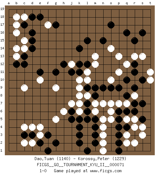 Last move : 1-0 2020 April 15 7:49:57 [Event "FICGS__GO__TOURNAMENT_KYU_II__000071"] [Site "FICGS"] [Date "2019.12.29"] [Round "1"] [Black "Dao,Tuan"] [White "Korossy,Peter"] [Result "1-0"] [Rating 1 "1140"] [Rating 2 "1229"] 1.q16 d4 2.d16 r4 3.q4 q3 4.p4 r5 5.p3 q2 6.p2 r8 7.q10 l3 8.k4 l4 9.k5 l5 10.l6 n5 11.n6 o5 12.q6 o6 13.r6 q5 14.r3 r2 15.p5 s3 16.p6 o7 17.s5 s4 18.q8 q9 19.p9 q7 20.r9 p7 21.r7 k6 22.d3 e3 23.c3 c4 24.e2 f2 25.f3 e4 26.g2 d2 27.f1 c2 28.j6 k7 29.o17 f17 30.e18 b16 31.d14 c18 32.g17 c15 33.k3 l10 34.d15 c14 35.c17 b17 36.d18 b18 37.c13 b13 38.c12 c9 39.k2 j7 40.b12 b14 41.k14 m13 42.l15 o14 43.l12 m12 44.n15 p13 45.g11 j12 46.s7 r13 47.k12 l11 48.k11 g9 49.r15 h6 50.j5 e10 51.e11 g5 52.m2 l2 53.l1 n2 54.m3 n3 55.m5 n1 56.m4 n4 57.p1 n7 58.m8 m7 59.l7 l8 60.l9 k8 61.n9 m6 62.l5 k9 63.m9 o10 64.o9 k10 65.j11 p11 66.r12 q12 67.r11 s13 68.s16 t10 69.s10 t11 70.h12 1-0 Here are the names of the openings (joseki) played in the four corners : Corner q4 : r4 q4 Komoku (Somok, Xiao~mu`) 3-4 Point. The komoku (3-4) point is the traditional corner enclosure move.. Corner d4 : d4 d3 Hoshi (Hwajeom, Seongjeom, Xingwei`) 4-4 Point. The star or hoshi (4-4) point, emphasizing influence at the potential expense of territory. Corner d16 : d16 f17 Hoshi (Hwajeom, Seongjeom, Xingwei`) 4-4 Point. The star or hoshi (4-4) point, emphasizing influence at the potential expense of territory. Ikken Kakari (Hankan Keolch'im, Yi Gua`jiao~, 1-Space Low Approach). White 2 is the standard approach move to the 4-4. Player Black won this Go (weiqi, baduk) game. Follow this game move after move (download)Don't get surrounded ! Ever ! (Anonymous) Live, lose, and learn, by observing your opponent how to win. (Amber Steenbock)