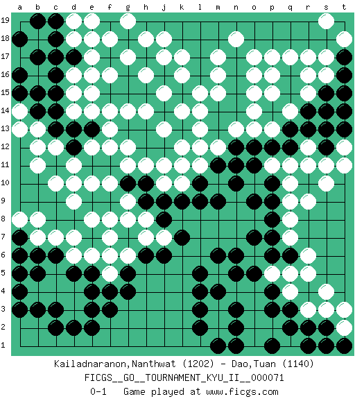Last move : 0-1 2020 April 11 5:0:7 [Event "FICGS__GO__TOURNAMENT_KYU_II__000071"] [Site "FICGS"] [Date "2019.12.29"] [Round "1"] [Black "Kailadnaranon,Nanthwat"] [White "Dao,Tuan"] [Result "0-1"] [Rating 1 "1202"] [Rating 2 "1140"] 1.q16 d4 2.q3 d16 3.f3 r17 4.c6 r16 5.q15 r15 6.c3 q14 7.e5 r5 8.p4 q8 9.c14 d10 10.f17 f16 11.g16 e17 12.f15 e16 13.g15 d14 14.d13 e14 15.e13 f14 16.b15 g17 17.h17 f18 18.j16 b16 19.c16 c17 20.c15 c12 21.c11 d11 22.d12 b11 23.c13 c10 24.b17 b18 25.a16 m16 26.p14 p13 27.r10 o14 28.r13 k17 29.n17 m17 30.n15 l14 31.m14 p15 32.n16 l13 33.m13 m15 34.n14 l12 35.n11 p11 36.r14 p17 37.p10 o10 38.o11 q10 39.p9 q9 40.p12 q11 41.q12 o13 42.q13 p16 43.o9 r11 44.o12 m12 45.l10 g12 46.h13 j11 47.g13 f13 48.k15 l15 49.j12 k11 50.g18 f12 51.f17 b13 52.c18 d18 53.c19 j18 54.h15 g14 55.j14 k16 56.h12 h11 57.f19 e18 58.j9 d19 59.d17 d3 60.e2 c17 61.b14 a14 62.d17 q17 63.c17 k14 64.r4 q5 65.o7 o6 66.p7 p5 67.o5 o4 68.n5 n4 69.n6 q4 70.p3 r3 71.r2 s4 72.s2 o2 73.m4 m3 74.l3 m2 75.l2 m5 76.l4 o3 77.p1 p2 78.q2 s3 79.n1 o1 80.n2 q1 81.m1 h8 82.h9 c4 83.c2 g8 84.f9 g9 85.g10 f10 86.h10 g11 87.j8 f8 88.e9 e8 89.h6 d6 90.d5 c5 91.b6 d7 92.b5 q7 93.p6 k10 94.l9 b4 95.b3 c7 96.a4 b7 97.a5 s11 98.s14 f5 99.f6 e6 100.e4 g6 101.g5 f7 102.g4 h7 103.j6 l11 104.t17 s16 105.t16 t15 106.s15 t18 107.t14 s17 108.t15 s19 109.q6 r6 110.n12 n13 111.s12 m10 112.m9 j7 113.k7 t2 114.n3 t12 115.t13 t11 116.m11 r12 117.p8 h14 118.a7 a8 119.a3 e12 120.k9 d15 121.s1 j15 122.a6 b8 123.n10 j13 124.f4 f6 125.s13 j10 126.p1 e10 127.a15 a13 128.t1 t3 129.pass d9 130.pass k12 131.a18 o15 132.d2 n18 133.e3 o17 134.m6 b12 135.l5 o16 136.r1 e15 137.b19 g17 138.pass h16 139.pass j17 140.pass h18 141.pass g19 142.pass e19 143.pass r9 144.pass s10 145.pass pass 0-1 Here are the names of the openings (joseki) played in the four corners : Corner d4 : d4 f3 Hoshi (Hwajeom, Seongjeom, Xingwei`) 4-4 Point. The star or hoshi (4-4) point, emphasizing influence at the potential expense of territory. Ikken Kakari (Hankan Keolch'im, Yi Gua`jiao~, 1-Space Low Approach). Black 2 is the standard approach move to the 4-4. Corner q16 : q16 r17 Hoshi (Hwajeom, Seongjeom, Xingwei`) 4-4 Point. The star or hoshi (4-4) point, emphasizing influence at the potential expense of territory. Corner q4 : q3 r5 Komoku (Somok, Xiao~mu`) 3-4 Point. The komoku (3-4) point is the traditional corner enclosure move.. Ikken Kakari (Hankan Keolch'im, Yi Gua`jiao~, 1-Space Low Pincer). The small knight move is the basic approach move to the 3-4 point stone. It has been continually used for over four centuries. There are limitless variations, with new moves constantly being discovered. White 2 opens the door to a treaure store of joseki. Corner d16 : d16 c14 Hoshi (Hwajeom, Seongjeom, Xingwei`) 4-4 Point. The star or hoshi (4-4) point, emphasizing influence at the potential expense of territory. Ikken Kakari (Hankan Keolch'im, Yi Gua`jiao~, 1-Space Low Approach). Black 2 is the standard approach move to the 4-4. Player White won this Go (weiqi, baduk) game. Follow this game move after move (download)The nature of a game comes from what is played, but it's the sensitivity to the possible and the impossible that gives it value. (Pierre Audouard) War is the child of passion, passion is the child of narcissism and narcissism is the child. (...) Another game ? (Thibault de Vassal)