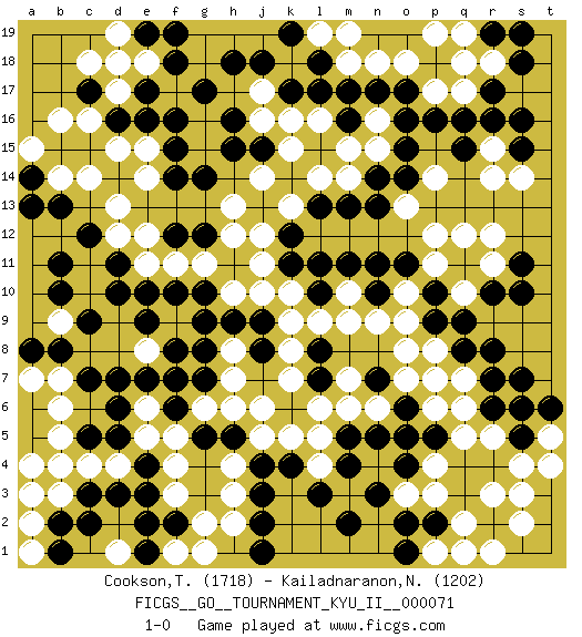 Last move : 1-0 2020 October 27 7:22:16 [Event "FICGS__GO__TOURNAMENT_KYU_II__000071"] [Site "FICGS"] [Date "2019.12.29"] [Round "1"] [Black "Cookson,Timothy"] [White "Kailadnaranon,Nanthwat"] [Result "1-0"] [Rating 1 "1718"] [Rating 2 "1202"] 1.q16 d4 2.q3 d17 3.c3 c4 4.d3 f3 5.f2 g2 6.e3 f4 7.e4 e5 8.d5 b5 9.d6 e6 10.e7 f7 11.c7 b3 12.e2 h3 13.b2 a2 14.c2 e8 15.d7 b7 16.b8 b6 17.f8 b9 18.a8 d1 19.f6 f5 20.g7 c14 21.c5 b4 22.a3 a4 23.b1 f1 24.e1 g1 25.d16 c16 26.e17 d18 27.c17 b16 28.g5 h4 29.e16 e18 30.f18 c18 31.k4 a3 32.h5 r5 33.j2 a1 34.q8 r3 35.r2 s3 36.q4 q5 37.p5 p6 38.o5 q7 39.r8 p8 40.p9 o8 41.r7 o9 42.s5 s6 43.r6 q6 44.s7 s2 45.r4 s4 46.t6 q2 47.p2 r1 48.o6 p7 49.p10 o10 50.o11 r14 51.n11 m9 52.l11 m10 53.m11 n6 54.n5 m6 55.m5 k9 56.s15 q17 57.p16 p17 58.o17 o18 59.n17 n18 60.m17 m18 61.l17 r15 62.r16 r18 63.d14 s14 64.s16 r11 65.q11 q12 66.r10 p12 67.s11 r12 68.o14 p11 69.s10 o13 70.l13 p14 71.n14 d13 72.c9 e14 73.g17 d15 74.l8 k7 75.l7 l6 76.n7 m7 77.l18 k8 78.b11 l4 79.m4 l5 80.l3 p3 81.o2 p4 82.m2 j14 83.j15 l14 84.g14 k13 85.m13 k15 86.g12 h13 87.f14 j11 88.g10 k10 89.s18 p19 90.r17 q18 91.s19 j16 92.r19 q19 93.c12 e11 94.f12 e12 95.h15 k16 96.k11 h10 97.h16 g9 98.j4 j6 99.j18 j5 100.f10 f9 101.h11 h12 102.h9 g11 103.e9 f11 104.e10 c10 105.d10 c11 106.d11 d12 107.b10 h6 108.o4 o3 109.n3 g6 110.q15 m14 111.n13 n15 112.o15 n16 113.o16 l16 114.m16 m15 115.j3 f7 116.g8 h2 117.f6 q10 118.q9 f7 119.b13 o7 120.j1 j17 121.h18 e15 122.f16 b14 123.a14 a15 124.a13 t4 125.l10 l9 126.f15 t5 127.s6 l19 128.k19 m19 129.e19 d19 130.f19 k5 131.j9 j10 132.n10 n9 133.k12 j12 134.j8 h7 135.f6 h8 136.g9 p1 137.o1 a7 138.k17 q1 139.f7 1-0 Here are the names of the openings (joseki) played in the four corners : Corner d4 : d4 c3 Hoshi (Hwajeom, Seongjeom, Xingwei`) 4-4 Point. The star or hoshi (4-4) point, emphasizing influence at the potential expense of territory. Corner q4 : q3 r5 Komoku (Somok, Xiao~mu`) 3-4 Point. The komoku (3-4) point is the traditional corner enclosure move.. Ikken Kakari (Hankan Keolch'im, Yi Gua`jiao~, 1-Space Low Pincer). The small knight move is the basic approach move to the 3-4 point stone. It has been continually used for over four centuries. There are limitless variations, with new moves constantly being discovered. White 2 opens the door to a treaure store of joseki. Player Black won this Go (weiqi, baduk) game. Follow this game move after move (download)Six eyes in a rectangle are alive. (Anonymous) Information on the Internet is subject to the same rules and regulations as conversation at a bar. (George Lundberg)
