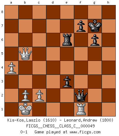 Last move : 0-1 2007 November 20 8:11:5 [Event "FICGS__CHESS__CLASS_C__000049"] [Site "FICGS"] [Date "2007.07.01"] [Round "1"] [White "Kis-Kos,Laszlo"] [Black "Leonard,Andrew"] [Result "0-1"] [WhiteElo "1610"] [BlackElo "1800"] 1.e4 c5 2.Nf3 d6 3.d4 cxd4 4.Nxd4 Nf6 5.Nc3 g6 6.Be3 Bg7 7.f3 O-O 8.Qd2 Nc6 9.O-O-O Nxd4 10.Bxd4 Be6 11.Kb1 Nd7 12.Bxg7 Kxg7 13.h4 h6 14.Bb5 Nf6 15.g4 Qa5 16.g5 hxg5 17.hxg5 Nh5 18.Ba4 Rac8 19.f4 Bg4 20.Rdg1 Bf3 21.Rh3 Rxc3 22.Rxf3 Rc5 23.Qd4+ e5 24.fxe5 Rxe5 25.Rb3 Nf4 26.Rb5 Qc7 27.Rxe5 dxe5 28.Qxa7 Qc4 29.Re1 Rd8 30.Qb6 Ne6 31.Bb3 Qxe4 32.Rc1 Re8 33.Bxe6 Rxe6 34.Qf2 Qf4 35.Qg2 e4 36.Rh1 e3 37.Qh3 Kf8 38.Qh8+ Ke7 39.Rd1 Rd6 40.Re1 Qxg5 41.Qc8 Qf4 42.Qxb7+ Kf6 43.Qb5 Qf2 44.Rf1 Kg7 45.a4 Re6 0-1 Sicilian : Dragon, Yugoslav attack, 7...O-O Kingside Castling by player Black (move 7) Queenside Castling by player White (move 9) Player Black won this chess game. Follow this game move after move (download)If a ruler does not understand Chess, how can he rule over a kingdom ? (King Khusros II) Pläne sind die Träume des Verständigen. (Ernst Freiherr von Feuchtersleben) El estómago es una parte esencial del maestro de Ajedrez. (Bent Larsen) Ce qui est bien, c'est d'avoir tout un tas de pièces en prise : l'adversaire ne peut en prendre qu'une à la fois. Cité par Thierry Audin. They misunderestimated me. (George W. Bush, Bentonville nov. 6, 2000)