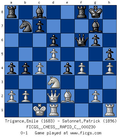 Last move : 0-1 2020 January 24 17:44:11 [Event "FICGS__CHESS__RAPID_C__000230"] [Site "FICGS"] [Date "2019.12.29"] [Round "1"] [White "Trigance,Emile"] [Black "Satonnet,Patrick"] [Result "0-1"] [WhiteElo "1683"] [BlackElo "1896"] 1.d4 f5 2.e4 fxe4 3.Nc3 Nf6 4.Bg5 Nc6 5.d5 Ne5 6.Qd4 Nf7 7.Bxf6 exf6 8.Nxe4 f5 9.Ng3 g6 10.O-O-O Bh6+ 11.f4 O-O 12.Nf3 Bg7 13.Qd2 b5 14.Nd4 Nd6 15.h4 h5 16.Nf3 a5 17.Ne5 Qf6 18.c3 b4 19.c4 Nb7 20.Be2 d6 21.Nd3 a4 22.Ne4 fxe4 0-1 Dutch : Staunton gambit, Staunton's line Queenside Castling by player White (move 10) Kingside Castling by player Black (move 11) Player Black won this chess game. Follow this game move after move (download)I'd rather have a Pawn than a finger. (Reuben Fine) Die Elozahlen sind sehr schlecht für das Schach. Jetzt ist Schach eine Sportindustrie, die darauf zielt Elopunkte zu machen. (Miguel Najdorf) En la perfecta combinación de Ajedrez como en una historia corta de primera clase, toda la trama y contra trama deberá conducir hacia un final sorprendente, el interes no es mitigado hasta el último momento. (Yates and Winter) J'apprécie les joueurs d'est-indienne, c'est grâce à eux que je nourris ma famille depuis tant d'années. (Petrosian) A generalist learns less and less about more and more until he knows nothing about everything. (Author unknown)