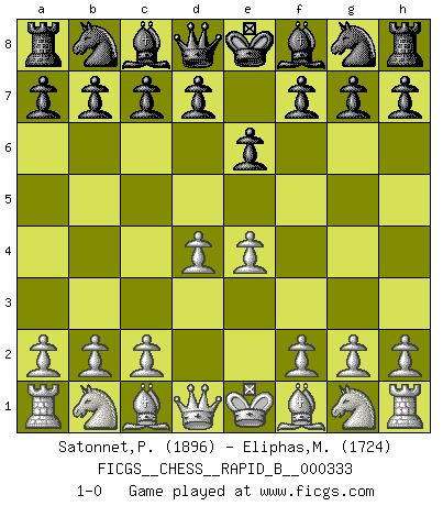 Last move : 1-0 2020 February 5 11:42:8 [Event "FICGS__CHESS__RAPID_B__000333"] [Site "FICGS"] [Date "2019.12.30"] [Round "1"] [White "Satonnet,Patrick"] [Black "Eliphas,Matthew"] [Result "1-0"] [WhiteElo "1896"] [BlackElo "1724"] 1.e4 e6 2.d4 1-0 This chess game has been lost on time (started : 2019.12.30 0:46:52) French defense Player White won this chess game. Follow this game move after move (download)Before the endgame, the Gods have placed the middle game. (Siegbert Tarrasch) Um dein Spiel zu verbessern musst du zuallererst das Endspiel studieren, denn diese kann unabhängig studiert werden. Die Eröffnung und das Mittelspiel müssen immer in Bezug gesetzt werden zum Endspiel. (José Raúl Capablanca) Fischer no está bajo la obligación de nadie. (Joseph Platz) Tout change constamment, y compris dans le monde des Echecs. (Botvinnik) Over-the-board chess is the favorite of mortals, correspondence chess is the favorite of the gods. (Eduard Dyckhoff)