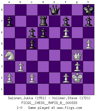 Last move : 1-0 2020 February 1 19:18:56 [Event "FICGS__CHESS__RAPID_B__000333"] [Site "FICGS"] [Date "2019.12.30"] [Round "1"] [White "Salonen,Jukka"] [Black "Vollmer,Steve"] [Result "1-0"] [WhiteElo "1951"] [BlackElo "1721"] 1.e4 e5 2.Nf3 Nc6 3.Bb5 d6 4.d4 exd4 5.Nxd4 Bd7 6.Nc3 Nf6 7.O-O Be7 8.Re1 O-O 9.Bxc6 bxc6 10.Bg5 Re8 11.Qf3 c5 12.Nf5 Bxf5 13.exf5 Qd7 14.Rad1 Rab8 15.b3 c6 16.Na4 Qb7 17.g3 Red8 18.Qe2 Kf8 19.Qd3 Qc8 20.Rxe7 Kxe7 21.Qe3+ Kf8 22.Bxf6 gxf6 23.Qh6+ Kg8 24.Qxf6 Qc7 25.Qg5+ Kh8 26.h4 Rd7 27.h5 Qd8 28.f6 Qg8 29.Qf4 Rbd8 30.Kg2 Qf8 31.Re1 Re8 32.Rxe8 Qxe8 33.Qg4 1-0 Ruy Lopez : Old Steinitz defense Kingside Castling by player White (move 7) Kingside Castling by player Black (move 8) Player White won this chess game. Follow this game move after move (download)All I want to do, ever, is just play Chess. (Bobby Fischer) Als er Schachweltmeister wurde ließ er praktisch alle stärksten Sovietspieler für sich arbeiten. Wenn ein auch nur mittelmässiger Meister ein Spezialist für eine bestimmte Eröffnung war, wurde er von Karpov gerufen. Das wurde alles geheim gehalten. (Mikhail Moiseyevich Botvinik) El hombre es un frívolo, una creatura engañosa y como un jugador de Ajedrez, se preocupa mas por el proceso de obtener su meta que de la meta por sí misma. (Dostoyevsky) J'ai vu le vaincu d'Echecs jouer des années durant dans l'espoir de la fête de la victoire. Car tu es plus riche de ce qu'elle existe si même elle n'est point pour toi. Ainsi de la perle du fond des mers. (Antoine de Saint-Exupéry) If I had no sense of humor, I would long ago have committed suicide. (Mahatma Gandhi)