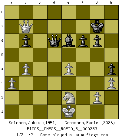 Last move : 1/2-1/2 2020 February 8 10:37:12 [Event "FICGS__CHESS__RAPID_B__000333"] [Site "FICGS"] [Date "2019.12.30"] [Round "1"] [White "Salonen,Jukka"] [Black "Gossmann,Ewald"] [Result "1/2-1/2"] [WhiteElo "1951"] [BlackElo "2026"] 1.d4 Nf6 2.c4 e6 3.Nf3 b6 4.e3 Be7 5.Nc3 d5 6.Bd3 Bb7 7.O-O O-O 8.cxd5 exd5 9.b3 c5 10.Bb2 Nbd7 11.Rc1 Bd6 12.Re1 Re8 13.Ba3 Ne4 14.Nb5 Bf8 15.Bb2 a6 16.Nc3 cxd4 17.Nxd4 Rc8 18.Bf1 Ndf6 19.f3 Nxc3 20.Bxc3 Ba3 21.Rc2 g6 22.Bb2 Bxb2 23.Rxb2 Qe7 24.Qd2 Rc5 25.Bd3 Nd7 26.Rc2 Rec8 27.Rec1 h5 28.h3 Ne5 29.Be2 Kh7 30.Kf1 Kg7 31.Kf2 Kg8 32.a3 h4 33.f4 Nd7 34.b4 Rxc2 35.Rxc2 Rxc2 36.Qxc2 Nf6 37.Bf3 Ne4+ 38.Bxe4 dxe4 39.Qe2 Qc7 40.Qg4 Qc1 41.Ne2 Qd2 42.f5 Bc8 43.Qxe4 Bxf5 44.Qa8+ Kg7 45.e4 Be6 46.Qxa6 Qd6 47.Ke1 f6 48.Qb7+ 1/2-1/2 Queen's Indian : 4.e3 Kingside Castling by player White (move 7) Kingside Castling by player Black (move 7) This chess game ended in a draw. Follow this game move after move (download)Chess is a part of culture and if a culture is declining then Chess too will decline. (Mikhail Botvinnik) Jeder Fehler erscheint unglaublich dumm, wenn andre ihn begehen. (Georg Christoph Lichtenberg) Un mal día en el Ajedrez, es mejor que cualquier buen día en el trabajo. (Anonymous) L'attaque fait le spectacle, la défense gagne les matchs. (Dicton footballistique) Gambling : The sure way of getting nothing from something. (Wilson Mizner)