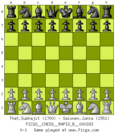 Last move : 0-1 2020 January 29 10:56:11 [Event "FICGS__CHESS__RAPID_B__000333"] [Site "FICGS"] [Date "2019.12.30"] [Round "1"] [White "That,Subhajit"] [Black "Salonen,Jukka"] [Result "0-1"] [WhiteElo "1700"] [BlackElo "1951"] 0-1 This chess game has been lost on time (started : 2019.12.30 0:46:52) Player Black won this chess game. Follow this game move after move (download)When you see a good move, look for a better one. (Emanuel Lasker) Versuche, dich von der Sklaverei der Eröffnungsvarianten zu befreien. Stattdessen soll man gewisse Typenpositionen erlernen, die man eingehend analysiert. (Aaron Nimzowitsch) Todos los jugadores de Ajedrez deberían tener un pasatiempo. (Savielly Tartakower) On est toujours la mazette de quelqu'un d'autre. (Anonyme) Logic : The art of thinking and reasoning in strict accordance with the limitations and incapacities of the human misunderstanding. (Ambrose Bierce)