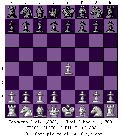 Last move : 1-0 2020 January 29 23:58:9 [Event "FICGS__CHESS__RAPID_B__000333"] [Site "FICGS"] [Date "2019.12.30"] [Round "1"] [White "Gossmann,Ewald"] [Black "That,Subhajit"] [Result "1-0"] [WhiteElo "2026"] [BlackElo "1700"] 1.e4 1-0 This chess game has been lost on time (started : 2019.12.30 0:46:52) King's pawn Opening Player White won this chess game. Follow this game move after move (download)Human affairs are like a Chess game: only those who do not take it seriously can be called good players. (Hung Tzu Ch'eng) Es hat in meinem Leben Zeiten gegeben, in denen das Schachspiel, wenn nicht zum Lebenszweck, so doch zu einem regelrechten Lebensersatz geworden ist. Man fühlt sich in solchen Zeiten nicht so, als besäße man eine göttliche Gabe, sondern eher so, als sei man von ihr besessen. (Garry Kasparov) Si tu oponente te ofrece un empate, trata de averiguar porque piensa él que esta en una posición peor. (Nigel Short) Dieu déplace le joueur, et celui-ci la pièce. Quel Dieu derrière Dieu commence donc la trame ? Arturo Perez-Reverte (prix de littérature policière 1993). A bird doesn't sing because it has an answer, it sings because it has a song. (Maya Angelou)
