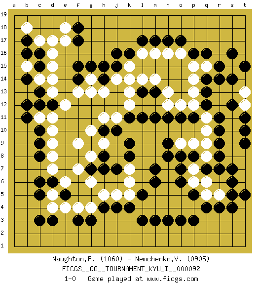 Last move : 1-0 2020 January 29 15:41:23 [Event "FICGS__GO__TOURNAMENT_KYU_I__000092"] [Site "FICGS"] [Date "2020.01.01"] [Round "1"] [Black "Naughton,Patrick"] [White "Nemchenko,Valery"] [Result "1-0"] [Rating 1 "1060"] [Rating 2 "0905"] 1.q16 d4 2.q4 d16 3.f3 f4 4.g3 g4 5.h4 h5 6.j4 j5 7.k4 k5 8.c10 d10 9.c9 d9 10.c8 d8 11.c6 d7 12.c12 d11 13.d12 c11 14.b11 e12 15.c15 d15 16.c16 l4 17.l3 m4 18.m3 n4 19.f17 d13 20.c13 c14 21.b14 d14 22.j16 d17 23.q13 p13 24.q12 e18 25.f18 e17 26.m17 p14 27.q14 p15 28.p16 o16 29.o17 n16 30.n17 m16 31.m13 l16 32.k16 k15 33.n11 p12 34.j15 k14 35.n9 m14 36.l11 l14 37.k9 n13 38.l17 o12 39.l13 k13 40.q7 q15 41.r15 q11 42.r11 r12 43.r14 s11 44.r10 s10 45.r9 s9 46.r8 s8 47.s7 t7 48.s6 t6 49.t5 t8 50.s5 s13 51.s14 t14 52.t15 t13 53.s16 j14 54.h10 q10 55.p11 q9 56.o11 n12 57.m11 q8 58.r7 p7 59.p8 p9 60.o8 o9 61.o7 p6 62.n3 o4 63.o3 p4 64.p3 q5 65.r4 r5 66.s4 q6 67.o6 o5 68.m6 n6 69.n8 n7 70.m7 n5 71.l5 m5 72.p5 k12 73.k11 j11 74.j10 h11 75.h7 k6 76.j7 k7 77.k8 g6 78.g7 f7 79.b12 b15 80.b16 c17 81.b17 b18 82.g15 g14 83.h14 h13 84.h15 f13 85.f14 g13 86.f15 g10 87.e5 e4 88.d6 d5 89.c3 e6 90.c5 g8 91.h8 f9 92.d3 h9 93.s12 t12 94.t11 r13 95.s12 t13 96.t10 t12 97.t9 1-0 Here are the names of the openings (joseki) played in the four corners : Corner d4 : d4 f3 Hoshi (Hwajeom, Seongjeom, Xingwei`) 4-4 Point. The star or hoshi (4-4) point, emphasizing influence at the potential expense of territory. Ikken Kakari (Hankan Keolch'im, Yi Gua`jiao~, 1-Space Low Approach). Black 2 is the standard approach move to the 4-4. Corner d16 : d16 c12 Hoshi (Hwajeom, Seongjeom, Xingwei`) 4-4 Point. The star or hoshi (4-4) point, emphasizing influence at the potential expense of territory. Corner q4 : q4 l4 Hoshi (Hwajeom, Seongjeom, Xingwei`) 4-4 Point. The star or hoshi (4-4) point, emphasizing influence at the potential expense of territory. Player Black won this Go (weiqi, baduk) game. Follow this game move after move (download)Don't be greedy ! (Anonymous) They misunderestimated me. (George W. Bush, Bentonville nov. 6, 2000)