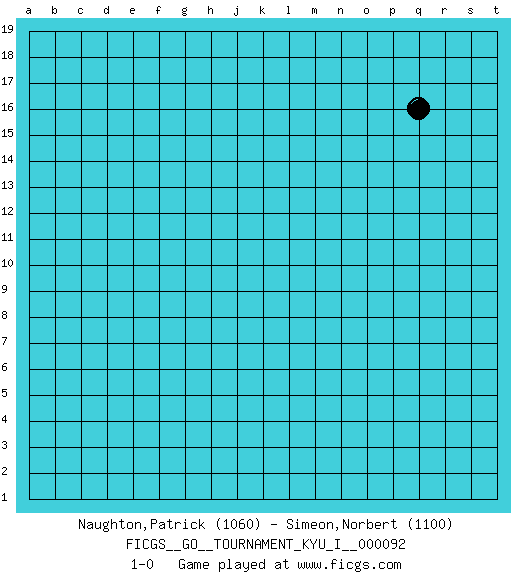 Last move : 1-0 2020 February 1 4:27:23 [Event "FICGS__GO__TOURNAMENT_KYU_I__000092"] [Site "FICGS"] [Date "2020.01.01"] [Round "1"] [Black "Naughton,Patrick"] [White "Simeon,Norbert"] [Result "1-0"] [Rating 1 "1060"] [Rating 2 "1100"] 1.q16 1-0 This go game has been lost on time (started : 2020.01.01 21:29:4) Here are the names of the openings (joseki) played in the four corners : Player Black won this Go (weiqi, baduk) game. Follow this game move after move (download)Add one stone, then sacrifice both. (Anonymous) As the days dwindle down... to a precious few. (Maxwell Anderson)