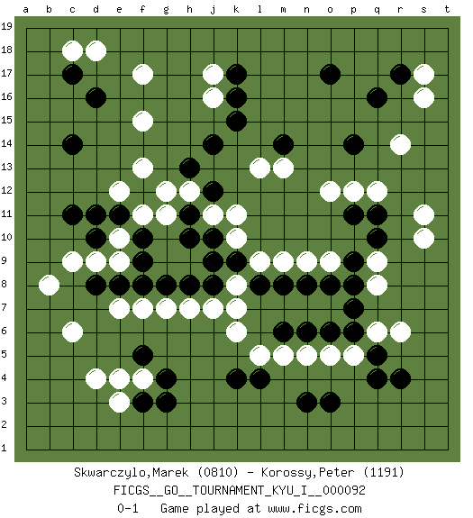 Last move : 0-1 2020 May 2 9:40:41 [Event "FICGS__GO__TOURNAMENT_KYU_I__000092"] [Site "FICGS"] [Date "2020.01.01"] [Round "1"] [Black "Skwarczylo,Marek"] [White "Korossy,Peter"] [Result "0-1"] [Rating 1 "0810"] [Rating 2 "1191"] 1.q4 d4 2.q16 r14 3.o17 s16 4.d16 f17 5.r17 s17 6.c14 d18 7.c17 c18 8.k16 j17 9.k17 j16 10.f3 f4 11.g4 e3 12.f5 e4 13.g3 c6 14.o3 r6 15.p6 q8 16.k4 k10 17.c11 c9 18.p14 q12 19.r4 k6 20.k15 l13 21.j14 f13 22.m14 m13 23.m6 l5 24.l4 m5 25.n6 n5 26.n3 o5 27.o6 p5 28.q5 q6 29.l8 j7 30.o8 m9 31.p9 q9 32.p11 p12 33.q11 o12 34.q10 s10 35.m8 n9 36.n8 o9 37.p8 s11 38.j12 g11 39.j8 k7 40.h8 k8 41.k9 l9 42.j9 k11 43.p7 h7 44.g8 g7 45.f8 f7 46.e8 e7 47.d8 b8 48.j10 j11 49.h11 h12 50.h10 f11 51.f10 e10 52.h13 g12 53.d10 d9 54.e11 e9 55.f9 e12 56.d11 f15 0-1 Here are the names of the openings (joseki) played in the four corners : Corner q16 : q16 r14 Hoshi (Hwajeom, Seongjeom, Xingwei`) 4-4 Point. The star or hoshi (4-4) point, emphasizing influence at the potential expense of territory. Ikken Kakari (Hankan Keolch'im, Yi Gua`jiao~, 1-Space Low Approach). White 2 is the standard approach move to the 4-4. Corner d16 : d16 f17 Hoshi (Hwajeom, Seongjeom, Xingwei`) 4-4 Point. The star or hoshi (4-4) point, emphasizing influence at the potential expense of territory. Ikken Kakari (Hankan Keolch'im, Yi Gua`jiao~, 1-Space Low Approach). White 2 is the standard approach move to the 4-4. Corner d4 : d4 f3 Hoshi (Hwajeom, Seongjeom, Xingwei`) 4-4 Point. The star or hoshi (4-4) point, emphasizing influence at the potential expense of territory. Ikken Kakari (Hankan Keolch'im, Yi Gua`jiao~, 1-Space Low Approach). Black 2 is the standard approach move to the 4-4. Player White won this Go (weiqi, baduk) game. Follow this game move after move (download)Keep inessential ataris till the end. (Anonymous) I can't decide which is riskier; taking crazy risks, or taking advice on crazy risks from a crazy risk taker. (Gregory House in House M.D.)