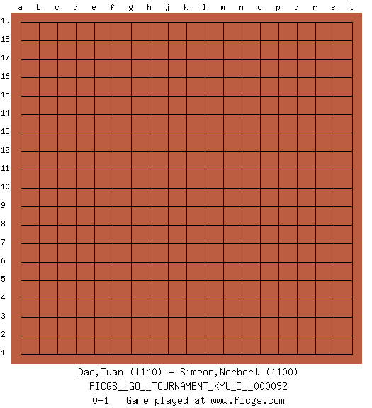 Last move : 0-1 2020 February 1 4:27:23 [Event "FICGS__GO__TOURNAMENT_KYU_I__000092"] [Site "FICGS"] [Date "2020.01.01"] [Round "1"] [Black "Dao,Tuan"] [White "Simeon,Norbert"] [Result "0-1"] [Rating 1 "1140"] [Rating 2 "1100"] 0-1 This go game has been lost on time (started : 2020.01.01 21:29:4) Here are the names of the openings (joseki) played in the four corners : Player White won this Go (weiqi, baduk) game. Follow this game move after move (download)Connect with good shape. (Anonymous) To err is human, to shift the blame on someone else is tactical. (Mladen Jankovic)