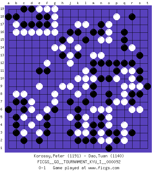 Last move : 0-1 2020 April 29 18:53:13 [Event "FICGS__GO__TOURNAMENT_KYU_I__000092"] [Site "FICGS"] [Date "2020.01.01"] [Round "1"] [Black "Korossy,Peter"] [White "Dao,Tuan"] [Result "0-1"] [Rating 1 "1191"] [Rating 2 "1140"] 1.q16 d4 2.f3 e3 3.f4 e5 4.c6 d6 5.b4 c5 6.b5 b6 7.c7 d16 8.f17 q4 9.o3 o4 10.n4 o5 11.n5 c8 12.b7 d7 13.c2 n3 14.m3 n2 15.m2 b8 16.a6 o2 17.r3 c3 18.b3 n6 19.p3 m6 20.m4 q3 21.p2 q2 22.o1 e9 23.k16 f16 24.e17 e16 25.d17 c16 26.c17 g16 27.e11 g17 28.n17 r14 29.r12 b17 30.b18 b16 31.a18 r10 32.p12 o15 33.q15 o17 34.n16 o16 35.q14 n15 36.l15 n13 37.k13 l17 38.m16 n11 39.r8 g18 40.f18 f19 41.d19 p10 42.q10 q9 43.s10 q11 44.s11 e19 45.e18 g19 46.c19 k17 47.j16 j5 48.j3 f12 49.f11 p18 50.r18 j12 51.h13 j13 52.j14 h14 53.h15 g14 54.e2 k14 55.j7 r6 56.g6 h9 57.k6 j15 58.k9 g8 59.m8 k10 60.o8 p7 61.l10 k8 62.l7 l9 63.m9 j9 64.m11 l11 65.m12 m10 66.n10 l10 67.n12 o11 68.o12 m13 69.o7 o6 70.r7 s6 71.o10 q7 72.p11 s9 73.s8 r9 74.t9 q8 75.q12 r11 76.s13 l5 77.k5 l4 78.k4 l3 79.l2 k3 80.k2 f6 81.f5 g7 0-1 Here are the names of the openings (joseki) played in the four corners : Corner d4 : d4 f3 Hoshi (Hwajeom, Seongjeom, Xingwei`) 4-4 Point. The star or hoshi (4-4) point, emphasizing influence at the potential expense of territory. Ikken Kakari (Hankan Keolch'im, Yi Gua`jiao~, 1-Space Low Approach). Black 2 is the standard approach move to the 4-4. Corner d16 : d16 f17 Hoshi (Hwajeom, Seongjeom, Xingwei`) 4-4 Point. The star or hoshi (4-4) point, emphasizing influence at the potential expense of territory. Ikken Kakari (Hankan Keolch'im, Yi Gua`jiao~, 1-Space Low Approach). Black 2 is the standard approach move to the 4-4. Corner q4 : q4 o3 Hoshi (Hwajeom, Seongjeom, Xingwei`) 4-4 Point. The star or hoshi (4-4) point, emphasizing influence at the potential expense of territory. Ikken Kakari (Hankan Keolch'im, Yi Gua`jiao~, 1-Space Low Approach). Black 2 is the standard approach move to the 4-4. Player White won this Go (weiqi, baduk) game. Follow this game move after move (download)Extend one hand from the cutting points. (Anonymous) For peace of mind, resign as general manager of the universe. (Douglas Adams)