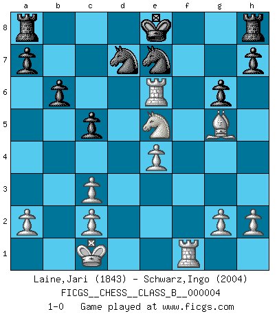 Last move : 1-0 2006 August 14 12:2:5 [Event "FICGS__CHESS__CLASS_B__000004"] [Site "FICGS"] [Date "2006.06.19"] [Round "1"] [White "Laine,Jari"] [Black "Schwarz,Ingo"] [Result "1-0"] [WhiteElo "1843"] [BlackElo "2004"] 1.e4 g6 2.d4 Bg7 3.Nc3 d6 4.f4 c5 5.dxc5 Bxc3+ 6.bxc3 dxc5 7.Qxd8+ Kxd8 8.Bc4 e6 9.Nf3 b6 10.f5 Ba6 11.Bxa6 Nxa6 12.fxe6 f6 13.Bf4 Ke7 14.O-O-O Kxe6 15.Rd6+ Kf7 16.Rf1 Ne7 17.Ne5+ Ke8 18.Rxf6 Nb8 19.Bg5 Nd7 20.Re6 1-0 Robatsch defense : Pseudo-Austrian attack Queenside Castling by player White (move 14) Player White won this chess game. Follow this game move after move (download)When I asked Fischer why he had not played a certain move in our game, he replied: 'Well, you laughed when I wrote it down !' (Mikhail Tal) Alles was ich jemals tun will ist Schach spielen. (Robert James Fischer) Las ideas audaces son como las piezas del Ajedrez que avanzan hacia adelante. Ellas pueden ser vencidas, pero también pueden iniciar una partida victoriosa. (Goethe) Roi des jeux et jeu des rois, les échecs portent en eux un sentiment d'infini. Ils donnent à celui qui s'est efforcé d'en approfondir les arcanes l'impression de n'être pas à la mesure de l'homme; en fait, ils constituent un résumé de l'univers, un microcosme, et figurent cette grande échelle qui, dans les plans de la lumière descend jusqu'à la matière, qui des abîmes insondables remonte jusqu'en l'infini de Dieu. (Pyrame) A good aphorism is too hard for the tooth of time, and is not worn away with the centuries, although it serves as food for every speech. (Friedrich Nietzsche)
