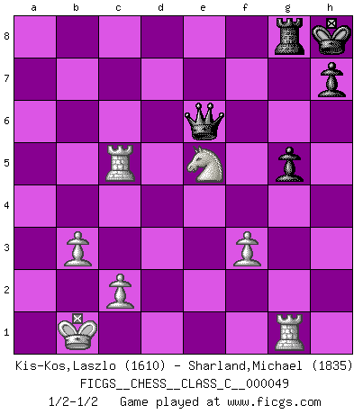 Last move : 1/2-1/2 2007 November 1 9:52:17 [Event "FICGS__CHESS__CLASS_C__000049"] [Site "FICGS"] [Date "2007.07.01"] [Round "1"] [White "Kis-Kos,Laszlo"] [Black "Sharland,Michael"] [Result "1/2-1/2"] [WhiteElo "1610"] [BlackElo "1835"] 1.e4 c5 2.Nf3 d6 3.d4 cxd4 4.Nxd4 Nf6 5.Nc3 a6 6.Be3 e5 7.Nb3 Be6 8.f3 Be7 9.Qd2 O-O 10.O-O-O Nbd7 11.g4 b5 12.g5 b4 13.Ne2 Ne8 14.h4 a5 15.Kb1 a4 16.Nbc1 Nb6 17.Ng3 d5 18.Bxb6 Qxb6 19.exd5 Rd8 20.Bc4 Nc7 21.dxe6 Rxd2 22.exf7+ Kh8 23.Rxd2 Qc6 24.b3 axb3 25.axb3 Nb5 26.Bxb5 Qxb5 27.Nf5 Rxf7 28.Nxe7 Rxe7 29.Rd8+ Re8 30.Rhd1 Rg8 31.Na2 Qb6 32.R8d5 Qf2 33.Nxb4 Qxh4 34.Nd3 Qxg5 35.Nxe5 Qf5 36.Rg1 g5 37.Rc5 Qe6 1/2-1/2 Sicilian : Najdorf, Byrne (English) attack Kingside Castling by player Black (move 9) Queenside Castling by player White (move 10) This chess game ended in a draw. Follow this game move after move (download)Life is a kind of Chess, with struggle, competition, good and ill events. (Benjamin Franklin) Man gibt nur Pakete auf. (Paul Keres) Botvinnik trataba de restarle el misterio al Ajedrez, siempre relacionandolo a situaciones de la vida ordinaria. El gustaba de llamar al Ajedrez un típico problema inexacto similar a aquellos de los cuales la gente siempre tiene que enfrentarse en la vida cotidiana. (Garry Kasparov) Le génie consiste à savoir transgresser les règles au moment opportun. (Teichmann) They say poker is a zero-sum game. It must be, because every time I play my sum ends up zero. (Max Shapiro)
