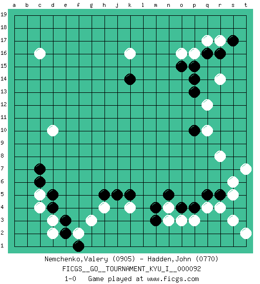 Last move : 1-0 2020 March 19 15:41:32 [Event "FICGS__GO__TOURNAMENT_KYU_I__000092"] [Site "FICGS"] [Date "2020.01.01"] [Round "1"] [Black "Nemchenko,Valery"] [White "Hadden,John"] [Result "1-0"] [Rating 1 "0905"] [Rating 2 "0770"] 1.d4 c16 2.q16 r4 3.q5 q4 4.r5 n4 5.n5 k4 6.k5 c4 7.d5 c5 8.c6 d3 9.e3 d2 10.e2 k16 11.k14 d10 12.c7 q17 13.r16 r17 14.s17 p16 15.p15 o16 16.o15 q10 17.p10 q12 18.p14 r14 19.p13 r8 20.s4 s3 21.t5 s6 22.t6 s5 23.t4 t7 24.t3 t2 25.p4 p3 26.o4 o3 27.m4 n3 28.m3 h4 29.j5 g3 30.h5 f2 31.f1 1-0 This go game has been lost on time (started : 2020.01.01 21:29:4) Here are the names of the openings (joseki) played in the four corners : Corner q4 : r4 q5 Komoku (Somok, Xiao~mu`) 3-4 Point. The komoku (3-4) point is the traditional corner enclosure move.. Corner d4 : d4 c4 Hoshi (Hwajeom, Seongjeom, Xingwei`) 4-4 Point. The star or hoshi (4-4) point, emphasizing influence at the potential expense of territory. Corner q16 : q16 q17 Hoshi (Hwajeom, Seongjeom, Xingwei`) 4-4 Point. The star or hoshi (4-4) point, emphasizing influence at the potential expense of territory. Player Black won this Go (weiqi, baduk) game. Follow this game move after move (download)The nature of a game comes from what is played, but it's the sensitivity to the possible and the impossible that gives it value. (Pierre Audouard) Thibault, I ask for draw. Game 13876. - Sorry Ilmars, you won. (FICGS chat)