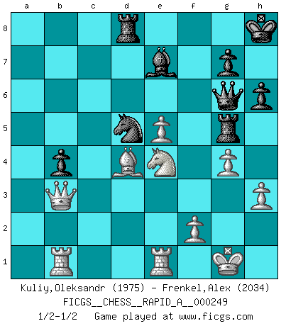 Last move : 1/2-1/2 2020 January 23 22:1:25 [Event "FICGS__CHESS__RAPID_A__000249"] [Site "FICGS"] [Date "2020.01.02"] [Round "1"] [White "Kuliy,Oleksandr"] [Black "Frenkel,Alex"] [Result "1/2-1/2"] [WhiteElo "1975"] [BlackElo "2034"] 1.e4 e5 2.Nf3 Nc6 3.Bb5 a6 4.Ba4 Nf6 5.O-O Be7 6.Re1 b5 7.Bb3 O-O 8.h3 Bb7 9.d3 d6 10.a3 Na5 11.Ba2 c5 12.Nbd2 Bc8 13.c3 Be6 14.Bxe6 fxe6 15.b4 cxb4 16.axb4 Nc6 17.Qb3 Qd7 18.Nf1 Rfb8 19.Ne3 a5 20.bxa5 Rxa5 21.Bd2 h6 22.Rab1 d5 23.exd5 exd5 24.Bc1 Rba8 25.Bb2 Re8 26.d4 e4 27.Ne5 Qe6 28.N5g4 b4 29.c4 dxc4 30.Nxc4 Rg5 31.Nge5 Nxe5 32.dxe5 Nd5 33.Nd2 Rd8 34.Bd4 Qg6 35.g4 Kh8 36.Nxe4 1/2-1/2 Ruy Lopez : Closed, 7...O-O Kingside Castling by player White (move 5) Kingside Castling by player Black (move 7) This chess game ended in a draw. Follow this game move after move (download)It began to feel as though you were playing against Chess itself. - On playing against Robert Fischer. (Walter Shipman) Ein typischer, sehr verbreiteter Gedankenschädling ist der, daß der betreffende Amateur von der Annanhme ausgeht, daß jeder einzelne Zug etwas zu leisten habe. (Aaron Nimzowitsch) Solo el jugador con la iniciativa tiene el derecho a atacar. (Wilhelm Steinitz) La solitude du joueur d'Echecs à l'approche du mat est semblable à celle du condamné. (Francis Szpiner) Philosophers use a language that is already deformed as though by shoes that are too tight. (Ludwig Wittgenstein)