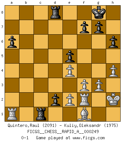 Last move : 0-1 2020 February 9 0:11:50 [Event "FICGS__CHESS__RAPID_A__000249"] [Site "FICGS"] [Date "2020.01.02"] [Round "1"] [White "Quintero,Raul"] [Black "Kuliy,Oleksandr"] [Result "0-1"] [WhiteElo "2091"] [BlackElo "1975"] 1.Nf3 d5 2.c4 e6 3.g3 Nf6 4.Bg2 Be7 5.O-O O-O 6.b3 d4 7.Bb2 c5 8.d3 Nc6 9.Nbd2 e5 10.a3 Bf5 11.Nh4 Be6 12.Qc2 Qd7 13.Rae1 Rad8 14.Bc1 h6 15.Nhf3 a6 16.Ne4 Nxe4 17.dxe4 Qc7 18.h3 b5 19.Nd2 Kh8 20.Kh2 Rb8 21.h4 Qd7 22.f3 Rfd8 23.Rf2 Kg8 24.Bb2 bxc4 25.Nxc4 Qb7 26.Nd2 c4 27.Nxc4 Qxb3 28.Rc1 Bxc4 29.Qxc4 Qxc4 30.Rxc4 Rxb2 31.Rxc6 d3 32.Rc1 Rd2 33.Bf1 Bxa3 34.Ra1 Rc2 35.Rxa3 d2 36.Ra1 Rc1 0-1 Reti Opening Kingside Castling by player White (move 5) Kingside Castling by player Black (move 5) Player Black won this chess game. Follow this game move after move (download)The most important feature of the Chess position is the activity of the pieces. This is absolutely fundamental in all phases of the game: Opening, Middlegame and especially Endgame. The primary constraint on a piece's activity is the Pawn structure. (Michael Stean) Der vorletzte Fehler gewinnt. (Savielly Grigorievitsch Tartakower) Haz el enroque temprano y seguido. (Rob Sillars) Ce qui est bien, c'est d'avoir tout un tas de pièces en prise : l'adversaire ne peut en prendre qu'une à la fois. Cité par Thierry Audin. Hardware: the parts of a computer that can be kicked. (Jeff Persis)