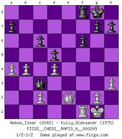 Last move : 1/2-1/2 2020 February 3 21:12:11 [Event "FICGS__CHESS__RAPID_A__000249"] [Site "FICGS"] [Date "2020.01.02"] [Round "1"] [White "Ambos,Ilmar"] [Black "Kuliy,Oleksandr"] [Result "1/2-1/2"] [WhiteElo "2042"] [BlackElo "1975"] 1.e4 e5 2.f4 d5 3.exd5 exf4 4.Nf3 Nf6 5.Bc4 Nxd5 6.O-O Be6 7.Qe2 Be7 8.d4 Nc6 9.Nc3 O-O 10.Nxd5 Bxd5 11.Bxd5 Qxd5 12.Bxf4 Bd6 13.Qd2 Rae8 14.Bxd6 cxd6 15.a4 f6 16.Rae1 Qf7 17.h3 d5 18.Ne5 Qc7 19.Nxc6 bxc6 20.b4 Qg3 21.Re2 Rxe2 22.Qxe2 Qc3 1/2-1/2 KGD : Falkbeer counter-gambit Kingside Castling by player White (move 6) Kingside Castling by player Black (move 9) This chess game ended in a draw. Follow this game move after move (download)Spassky will not be psyched out by Fischer. (Mike Goodall) Heutzutage gewinnt im Turnier nicht derjenige Spieler, der weitreichende Pläne entwirft, sondern einfach jener, der Zug um Zug kämpft. (David Bronstein) Yo no le temo a Spassky. Todos saben que yo soy el mejor. Uno no necesita un torneo para probarlo. (Bobby Fischer) J'ai toujours senti une vague pitié pour l'homme qui ne connaît rien aux échecs, tout comme j'en aurais pour un homme ignorant de l'amour. Les Echecs, comme la musique ou comme l'amour, ont le pouvoir de rendre heureux. (Siegbert Tarrasch) The difference between stupidity and genius is that genius has its limits. (Murphy)