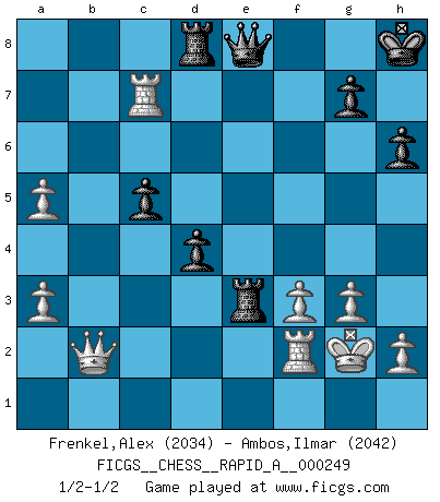 Last move : 1/2-1/2 2020 February 27 9:47:57 [Event "FICGS__CHESS__RAPID_A__000249"] [Site "FICGS"] [Date "2020.01.02"] [Round "1"] [White "Frenkel,Alex"] [Black "Ambos,Ilmar"] [Result "1/2-1/2"] [WhiteElo "2034"] [BlackElo "2042"] 1.e4 e6 2.d4 d5 3.Nd2 Nf6 4.e5 Nfd7 5.Bd3 c5 6.c3 Nc6 7.Ne2 cxd4 8.cxd4 f6 9.exf6 Nxf6 10.O-O Bd6 11.Nf3 O-O 12.Bf4 Bxf4 13.Nxf4 Ne4 14.Ne2 Bd7 15.Rc1 Be8 16.Ng3 Rf4 17.Re1 Ng5 18.Nxg5 Qxg5 19.Rxe6 Nxd4 20.Re3 Bc6 21.Qe1 Raf8 22.Re5 Qd8 23.Ne2 Nxe2+ 24.Rxe2 R4f6 25.a3 a6 26.R1c2 h6 27.g3 Qd7 28.Re7 Qg4 29.Rd2 Kh8 30.Bb1 d4 31.Be4 Rd6 32.Bxc6 bxc6 33.b4 Rfd8 34.Kg2 a5 35.f3 Qg6 36.bxa5 c5 37.Rc7 Re6 38.Qc1 Qe8 39.Qb2 Re3 40.Rf2 1/2-1/2 French : Tarrasch, Closed variation Kingside Castling by player White (move 10) Kingside Castling by player Black (move 11) This chess game ended in a draw. Follow this game move after move (download)You have to have the fighting spirit. You have to force moves and take chances. (Bobby Fischer) Kombinieren und Schwarzhandel gehören verboten. (Savielly Grigorievitsch Tartakower) EL Ajedrez es como la vida. (Boris Spassky) Si rien de grave n'est détecté lors de l'analyse d'une position, on joue alors le coup. Seconde règle de Blumenfeld. Luck is what you have left over after you give 100 percent. (Langston Coleman)