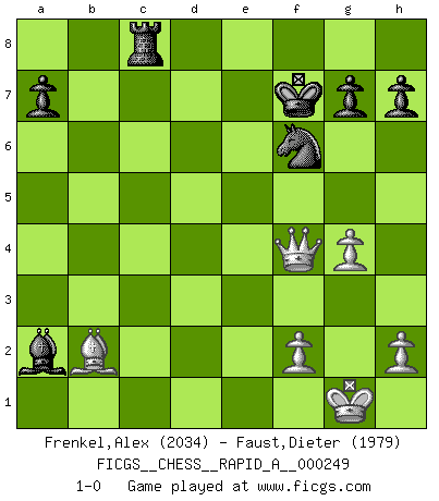 Last move : 1-0 2020 February 6 17:2:44 [Event "FICGS__CHESS__RAPID_A__000249"] [Site "FICGS"] [Date "2020.01.02"] [Round "1"] [White "Frenkel,Alex"] [Black "Faust,Dieter"] [Result "1-0"] [WhiteElo "2034"] [BlackElo "1979"] 1.e4 Nf6 2.e5 Nd5 3.d4 d6 4.Nf3 dxe5 5.Nxe5 c6 6.Be2 Bf5 7.O-O Nd7 8.Nf3 Nb4 9.c3 Nd5 10.c4 Nb4 11.d5 cxd5 12.cxd5 Nb6 13.Nc3 N4xd5 14.Qb3 Nxc3 15.bxc3 Be6 16.c4 f6 17.Re1 Bf7 18.Ba3 Qc8 19.Qb4 e5 20.c5 Be7 21.Bb5+ Kf8 22.Nxe5 fxe5 23.Rxe5 Nd5 24.Qd2 Qd8 25.Rae1 Rc8 26.Bc4 Nf6 27.Qf4 Bxc4 28.Rxe7 Qxe7 29.Rxe7 Kxe7 30.c6 Ke8 31.cxb7 Kf7 32.bxc8Q Rxc8 33.Bb2 Bxa2 34.g4 1-0 Alekhine's defense : Modern, Larsen variation Kingside Castling by player White (move 7) Promotion Queen by player White (move 32) Player White won this chess game. Follow this game move after move (download)When I asked Fischer why he had not played a certain move in our game, he replied: 'Well, you laughed when I wrote it down !' (Mikhail Tal) Wer sich die Fähigkeit anerziehen will im Schach selbstständig zu denken, der muß alles meiden, was leblos ist: ausgeklügelte Theorien, die sich auf sehr wenige Beispiele und eine Menge Hirngespinste stützen. (Emanuel Lasker) A través de las casillas del tablero, los Indios explican el movimiento del tiempo y la edad, las influencias mas altas que controlan el mundo y los lazos que vinculan al Ajedrez con el alma humana. (Al-Masudi) Aucun coup ne doit être joué sans but. (Pedro Damiano) It's not the will to win, but the will to prepare to win that makes the difference. (Bear Bryant)