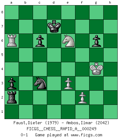 Last move : 0-1 2020 March 25 15:42:56 [Event "FICGS__CHESS__RAPID_A__000249"] [Site "FICGS"] [Date "2020.01.02"] [Round "1"] [White "Faust,Dieter"] [Black "Ambos,Ilmar"] [Result "0-1"] [WhiteElo "1979"] [BlackElo "2042"] 1.Nf3 Nf6 2.c4 d5 3.cxd5 Nxd5 4.Nc3 g6 5.Qa4+ Nc6 6.Ne5 Qd6 7.Nxc6 Qxc6 8.Qxc6+ bxc6 9.g3 Bg7 10.Bg2 Be6 11.a3 Rb8 12.Ne4 O-O 13.e3 Bxb2 14.Bxb2 Rxb2 15.Nc5 Bc8 16.Nd3 Rb6 17.Ne5 Rd8 18.O-O f6 19.Nc4 Ra6 20.Rfc1 e5 21.Bf1 Ne7 22.a4 Kf8 23.a5 c5 24.Rcb1 e4 25.Rb8 Ke8 26.Rab1 Re6 27.Rc1 Ba6 28.Rxd8+ Kxd8 29.Nb2 f5 30.d3 exd3 31.Bxd3 Rd6 32.Bxa6 Rxa6 33.Rxc5 Rc6 34.Rb5 Rc1+ 35.Kg2 Rb1 36.a6 Kd7 37.h3 Ra1 38.Rb4 Rxa6 39.Rd4+ Kc6 40.Nd3 Ra5 41.Rh4 h5 42.Rc4+ Kb6 43.g4 hxg4 44.hxg4 fxg4 45.Nb2 c6 46.Rxg4 Kb5 47.Nc4 Ra2 48.Nd6+ Kc5 49.Nb7+ Kb6 50.Rb4+ Kc7 51.Rb3 a5 52.Nc5 Nd5 53.Kg3 a4 54.Rb7+ Kc8 55.Ra7 a3 56.Kg4 Nc3 57.Ra6 Kc7 58.Ne6+ Kd7 0-1 Reti Opening Kingside Castling by player Black (move 12) Kingside Castling by player White (move 18) Player Black won this chess game. Follow this game move after move (download)Chess is no whit inferior to the violin, and we have a large number of professional violinists. (Mikhail Botvinnik) Wie gewinnt Tal? Er entwickelt alle seine Figuren in die Brettmitte und opfert sie dann irgendwo. (Robert James Fischer) No es suficiente ser un buen jugador, se debe también de jugar bién. (Siegbert Tarrasch) Ne tendez aucun piège pour le plaisir ! Ne jouez rien dans l'espoir que l'adversaire réagisse de façon stupide ! Prenez toujours pour acquis que l'adversaire va trouver le meilleur coup ! Ne jouez jamais de coup dans l'espoir que l'adversaire ne voie pas la menace ! Chacun de vos coups doit améliorer la position d'une façon ou d'une autre. Even the best needles are not sharp at both ends. (Chinese proverb)
