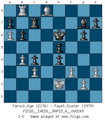 Last move : 1-0 2020 February 4 12:32:39 [Event "FICGS__CHESS__RAPID_A__000249"] [Site "FICGS"] [Date "2020.01.02"] [Round "1"] [White "Farnik,Kym"] [Black "Faust,Dieter"] [Result "1-0"] [WhiteElo "2176"] [BlackElo "1979"] 1.d4 Nf6 2.Nf3 d5 3.Bf4 g6 4.e3 Bg7 5.c3 O-O 6.h3 b6 7.Nbd2 Nbd7 8.Be2 Bb7 9.a4 c5 10.a5 Ne4 11.a6 Bc6 12.Nxe4 dxe4 13.d5 exf3 14.dxc6 fxe2 15.Qxd7 Qxd7 16.cxd7 Rad8 17.Kxe2 e5 18.Bg3 Rxd7 19.Rhd1 Rfd8 20.b4 c4 21.Rxd7 Rxd7 22.e4 Kf8 23.Bh4 f6 24.f3 Ke8 25.Bf2 Rd8 26.Rd1 Rc8 27.Rd5 Ke7 28.Be3 f5 29.Bg5+ Ke6 30.Rd8 Rc7 31.Rb8 fxe4 32.Bd8 1-0 Queen's pawn game Kingside Castling by player Black (move 5) Player White won this chess game. Follow this game move after move (download)I have always a slight feeling of pity for the man who has no knowledge of Chess. (Siegbert Tarrasch) Ich bin stolz ein Bulgare zu sein. (Veselin Topalov) Una buena memoria, concentración, imaginación y una fuerte voluntad, se requiere para llegar a ser un buen jugador. (Bobby Fischer) Le système Elo représente seulement une moyenne. Il est simplement un indicateur de votre stabilité. (Anatoli Karpov) The weakness of an artist is dogma. (Josh Waitzkin)