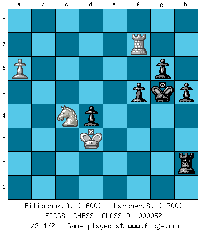 Last move : 1/2-1/2 2007 November 5 1:15:18 [Event "FICGS__CHESS__CLASS_D__000052"] [Site "FICGS"] [Date "2007.07.04"] [Round "1"] [White "Pilipchuk,Andrey"] [Black "Larcher,Sebastien"] [Result "1/2-1/2"] [WhiteElo "1600"] [BlackElo "1700"] 1.d4 Nf6 2.c4 c5 3.d5 b5 4.cxb5 a6 5.b6 Qxb6 6.Nc3 d6 7.Nf3 g6 8.Nd2 Bg7 9.e4 O-O 10.Be2 Qc7 11.Nc4 Nbd7 12.Bf4 Nb6 13.Ne3 Bd7 14.O-O Rfb8 15.Bg3 Bb5 16.f4 Qb7 17.Rc1 Nxe4 18.Nxe4 Bxb2 19.Rb1 Bd4 20.Bf2 Nxd5 21.Nxd5 Qxd5 22.Nc3 Bxe2 23.Nxd5 Bxd1 24.Rfxd1 e5 25.Nb6 Ra7 26.Nc4 Rxb1 27.Rxb1 exf4 28.Nxd6 Rd7 29.Rb6 a5 30.Ra6 f5 31.Kf1 a4 32.Bxd4 cxd4 33.Ke2 Re7+ 34.Kd2 Re3 35.Nc4 Rc3 36.Rxa4 f3 37.gxf3 Rxf3 38.Ra8+ Kg7 39.Ra7+ Kh6 40.a4 Rh3 41.Rf7 Rxh2+ 42.Kd3 Kg5 43.a5 h5 44.a6 1/2-1/2 Benko gambit half accepted Kingside Castling by player Black (move 9) Kingside Castling by player White (move 14) 10 pieces endgame at move 41 : White KRNP , Black KRPPPP WHITE : King + 1 Rook 1 Knight 1 Pawn BLACK : King + 1 Rook 4 Pawns This chess game ended in a draw. Follow this game move after move (download)By playing at Chess then, we may learn: First: Foresight... Second: Circumspection... Third: Caution... And lastly, we learn by Chess the habit of not being discouraged by present bad appearances in the state of our affairs, the habit of hoping for a favorable chance, and that of persevering in the secrets of resources. (Benjamin Franklin) Der Knackpunkt bei der Konzentration ist, daß wir nur durch sie etwas Neues und Ungewöhnliches am Schachbrett finden können. Sie ist der einzige Weg durch neue neue Ideen eine Überraschung zu bereiten. (Garry Kasparov) ¡Examina movidas que hagan daño! Un buen ojo for movidas desvastantes es mucho mas importante que el conocimiento de principios estratégicos. (Purdy) Si rien de grave n'est détecté lors de l'analyse d'une position, on joue alors le coup. Seconde règle de Blumenfeld. Unless I accept my faults I will most certainly doubt my virtues. (Hugh Prather)